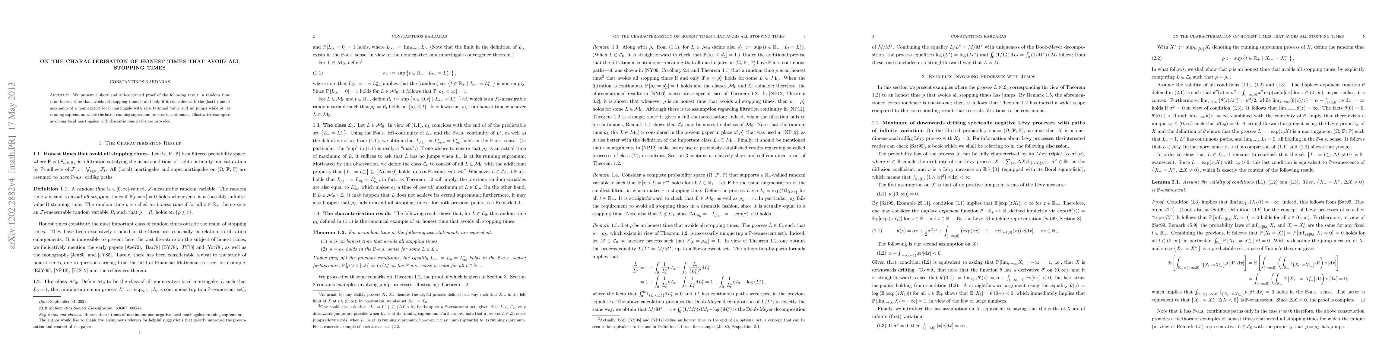 We present a short and self-contained proof of the following result: a random time is an honest time that avoids all stopping times if and only if it coincides with the (last) time of maximum of a nonnegative local martingale with zero terminal value and no jumps while at its running supremum, where the latter running supremum process is continuous. Illustrative examples involving local martingales with discontinuous paths are provided.