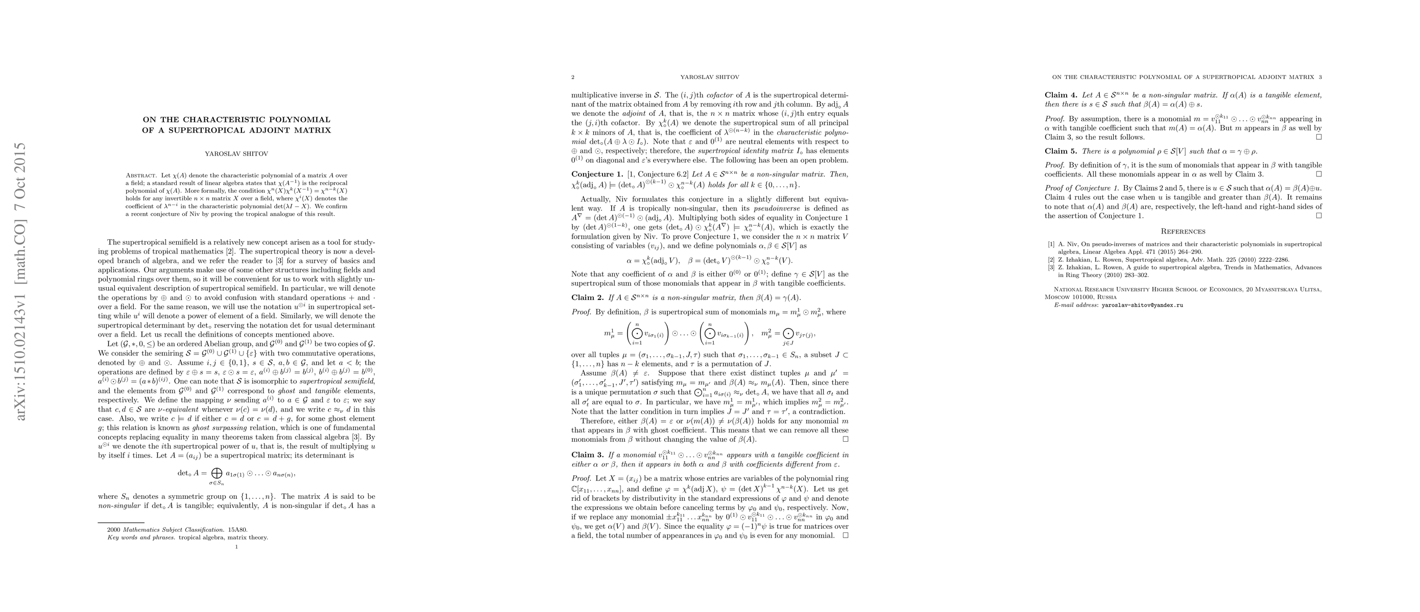 This paper proves the tropical analogue of the linear algebra result that the characteristic polynomial of the inverse of a matrix is the reciprocal of the original polynomial. It confirms Niv's conjecture by demonstrating the same relationship holds for supertropical adjoint matrices.
