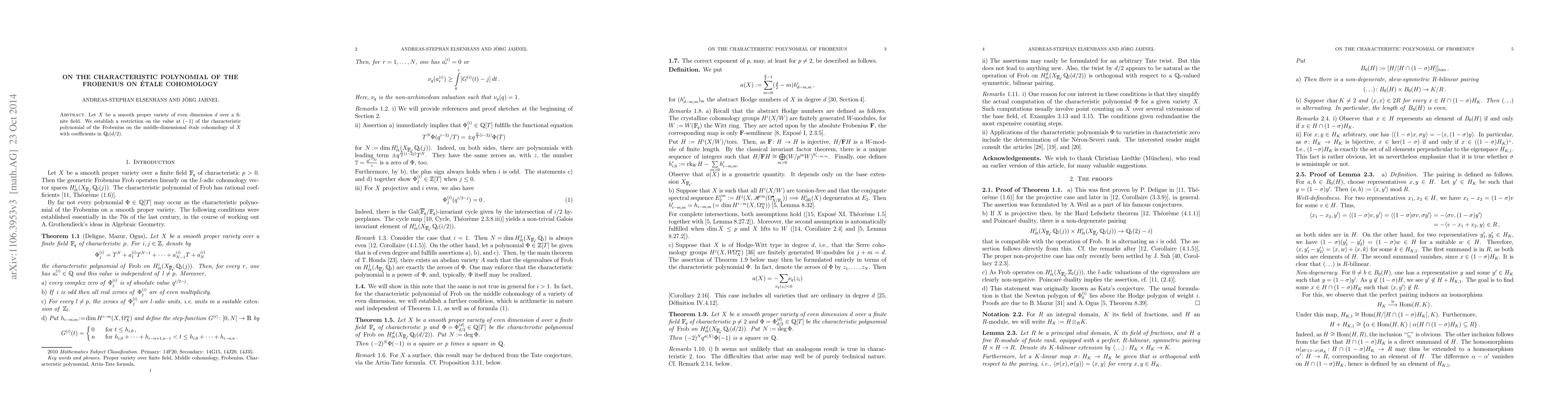This research paper focuses on a smooth proper variety X over a finite field, proving a restriction on the characteristic polynomial of the Frobenius acting on its middle-dimensional etale cohomology with coefficients in Q_l(d/2), where d is the variety's even dimension.
