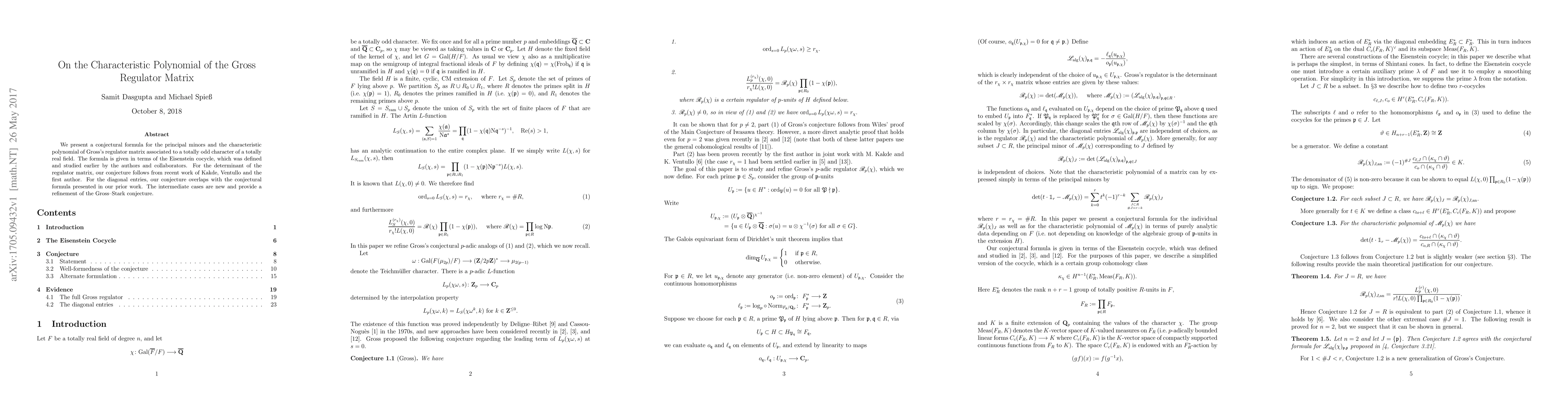 The paper proposes a new conjectural formula for the principal minors and characteristic polynomial of Gross's regulator matrix related to totally odd characters in totally real fields, expressed in terms of the Eisenstein cocycle. The conjecture extends recent findings and refines the Gross-Stark conjecture for intermediate cases.