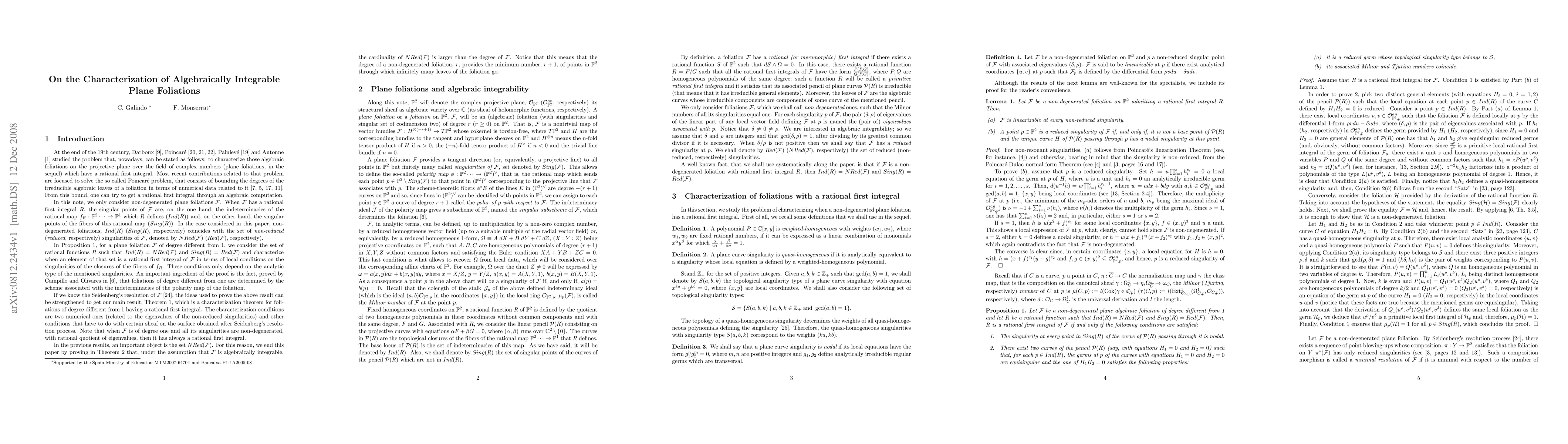 We give a characterization theorem for non-degenerated plane foliations of degree different from 1 having a rational first integral. Moreover, we prove that the degree $r$ of a non-degenerated foliation as above provides the minimum number, $r+1$, of points in the projective plane through which infinitely many algebraic leaves of the foliation go.