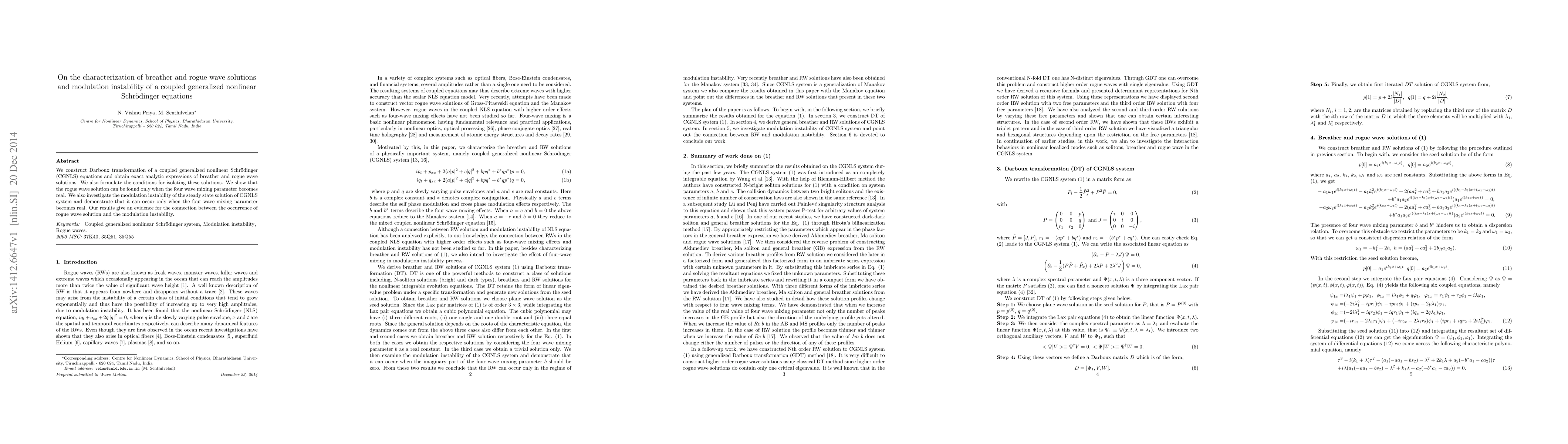 This paper constructs Darboux transformation for coupled generalized nonlinear Schrödinger equations to derive exact analytic expressions for breather and rogue wave solutions, establishing conditions for their isolation. It finds that both rogue waves and modulation instability occur when the four wave mixing parameter is real, suggesting a link between these phenomena.
