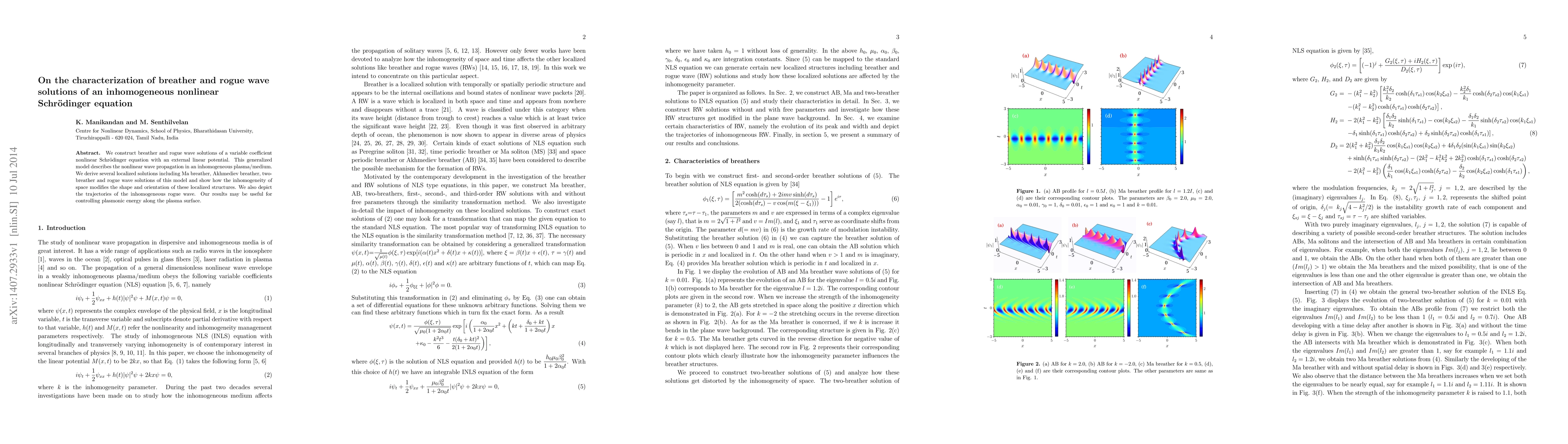 This paper constructs breather and rogue wave solutions for a variable coefficient nonlinear Schrödinger equation with an external potential, describing nonlinear wave propagation in inhomogeneous media. It derives localized solutions including Ma and Akhmediev breathers, two-breather, and rogue wave solutions, illustrating the impact of spatial inhomogeneity on these structures and their potential application in controlling plasmonic energy.