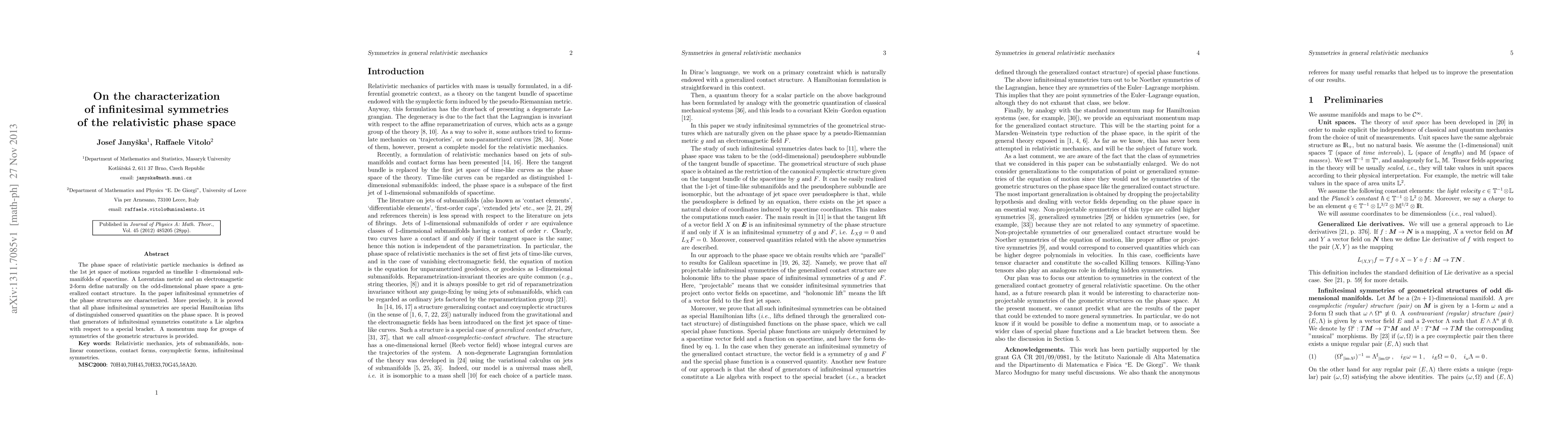 This paper characterizes infinitesimal symmetries in the relativistic phase space, showing that these symmetries are Hamiltonian lifts of conserved quantities. It establishes that the generators form a Lie algebra under a specific bracket and provides a momentum map for symmetry groups.