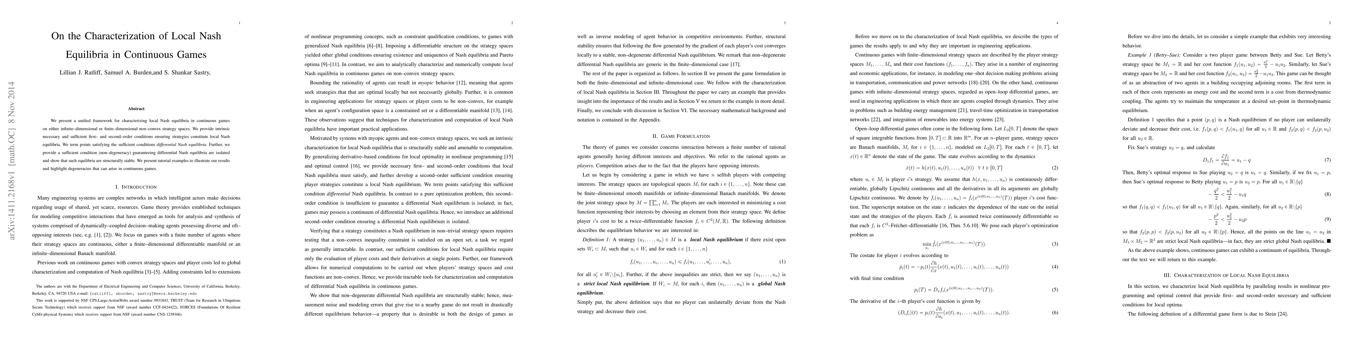 This paper develops a framework for characterizing local Nash equilibria in continuous games, providing necessary and sufficient first- and second-order conditions. It identifies "differential Nash equilibria" and offers a non-degeneracy condition ensuring their isolation and structural stability, with illustrative examples.