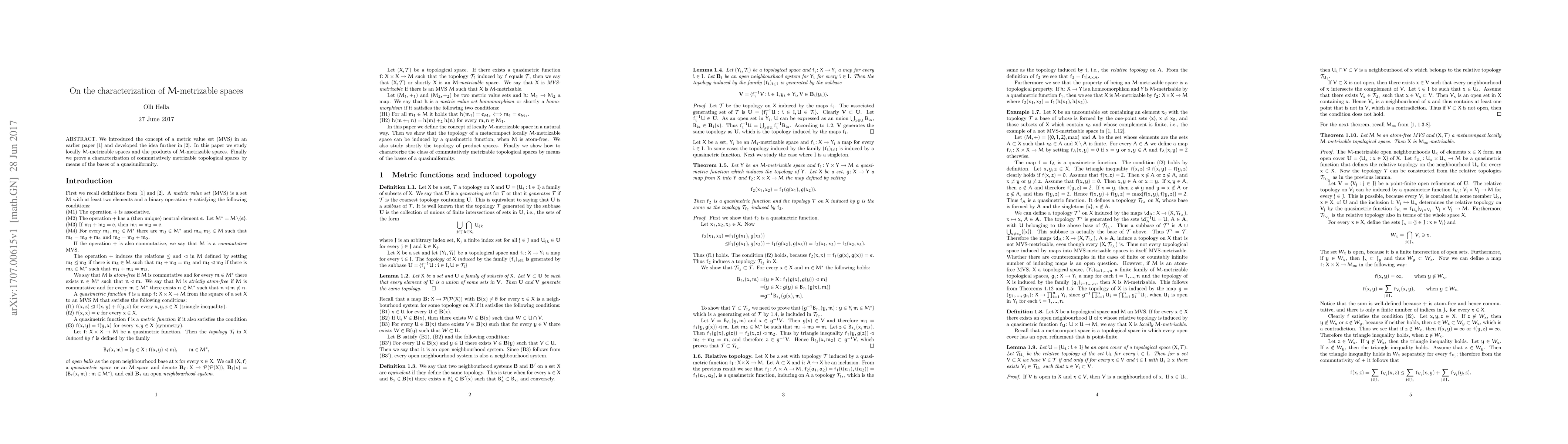 We introduced the concept of a metric value set (MVS) in an earlier paper \cite{GM} and developed the idea further in \cite{AS}. In this paper we study locally $M$-metrizable spaces and the products of $M$-metrizable spaces. Finally we prove a characterization of commutatively metrizable topological spaces by means of the bases of a quasiuniformity.