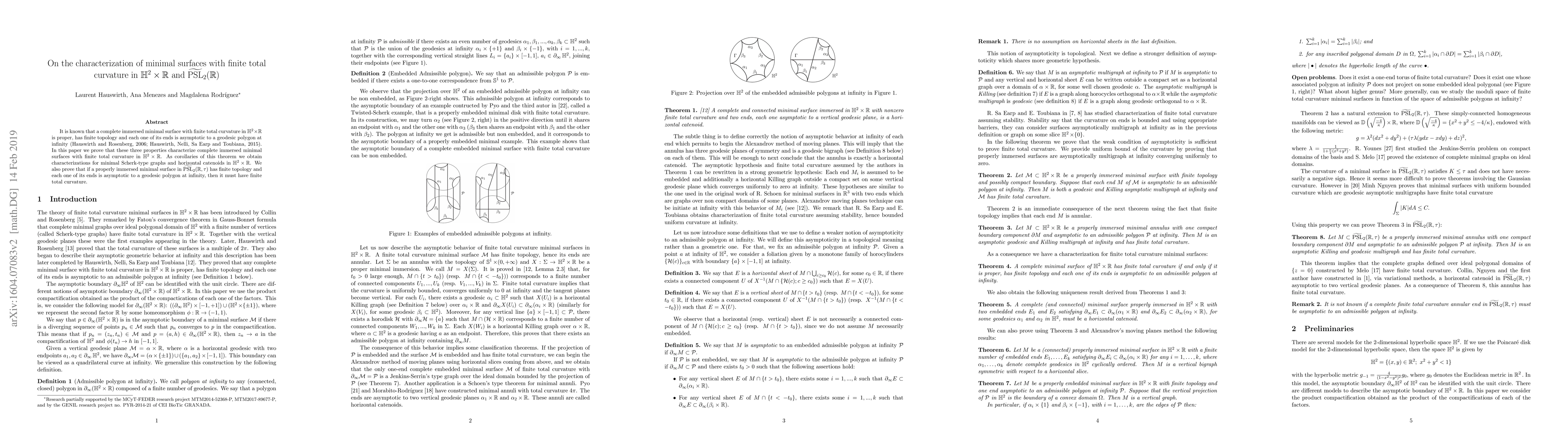 It is known that a complete immersed minimal surface with finite total curvature in $\mathbb H^2\times\mathbb R$ is proper, has finite topology and each one of its ends is asymptotic to a geodesic polygon at infinity (Hauswirth and Rosenberg, 2006; Hauswirth, Nelli, Sa Earp and Toubiana, 2015). In this paper we prove that these three properties characterize complete immersed minimal surfaces with finite total curvature in $\mathbb H^2\times\mathbb R$. As corollaries of this theorem we obtain characterizations for minimal Scherk-type graphs and horizontal catenoids in $\mathbb H^2\times\mathbb R$. We also prove that if a properly immersed minimal surface in $\widetilde{\rm PSL}_2(\mathbb{R},\tau)$ has finite topology and each one of its ends is asymptotic to a geodesic polygon at infinity, then it must have finite total curvature.