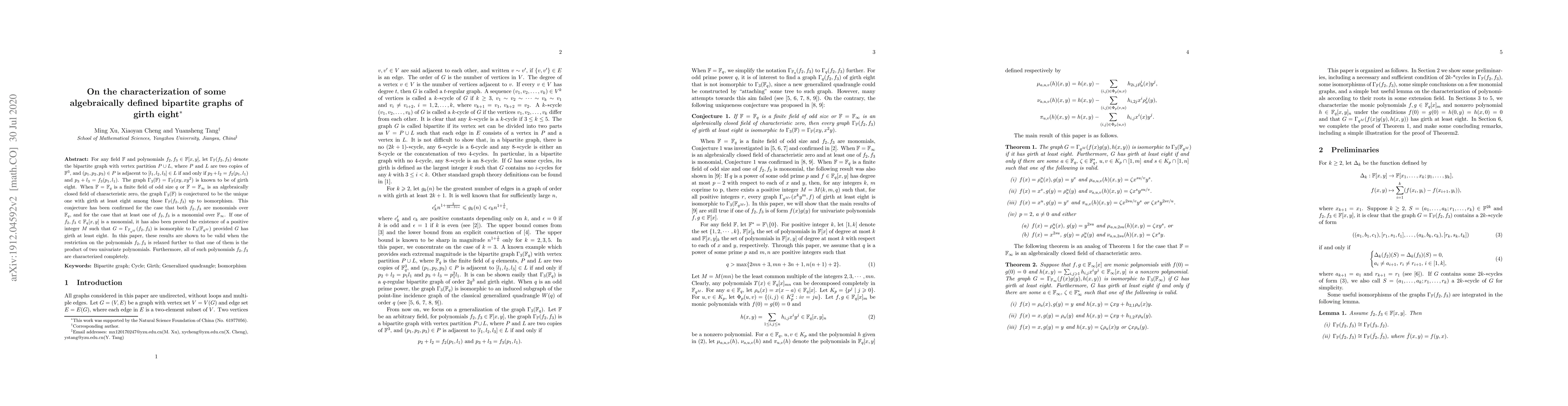 This paper characterizes algebraically defined bipartite graphs $\Gamma_{\mathbb{F}}(f_{2},f_{3})$ of girth eight, proving that $\Gamma_{3}(\mathbb{F})$ is unique up to isomorphism when $\mathbb{F}$ is a finite field or an algebraically closed field. The conjecture is extended to cases where one of $f_{2}$ or $f_{3}$ is the product of two univariate polynomials.