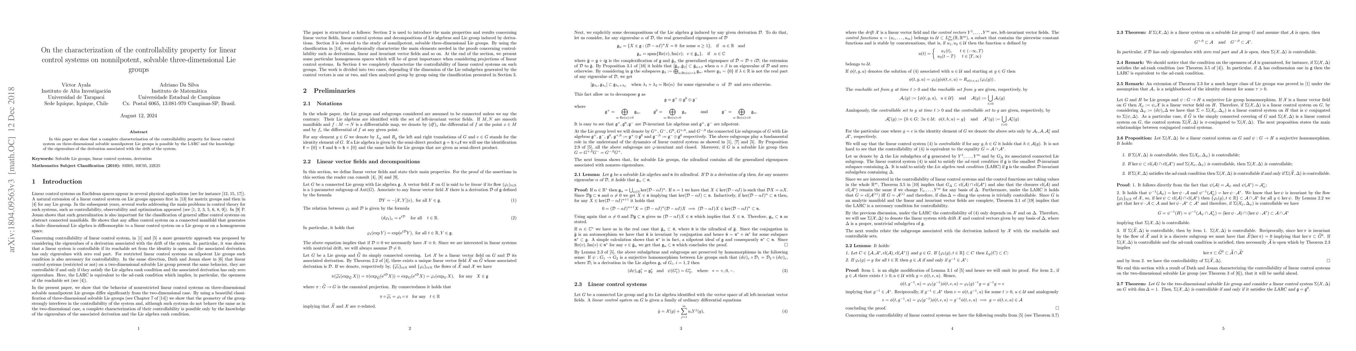 This paper presents a complete characterization of controllability for linear control systems on three-dimensional solvable nonnilpotent Lie groups using the LARC method and the eigenvalues of the system's drift derivation.