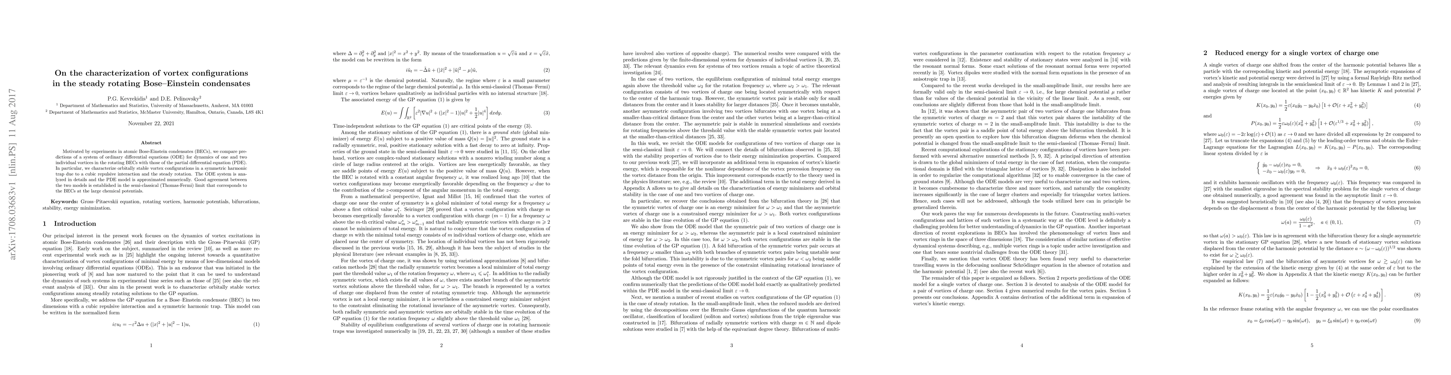Motivated by experiments in atomic Bose-Einstein condensates (BECs), we compare predictions of a system of ordinary differential equations (ODE) for dynamics of one and two individual vortices in the rotating BECs with those of the partial differential equation (PDE). In particular, we characterize orbitally stable vortex configurations in a symmetric harmonic trap due to a cubic repulsive interaction and the steady rotation. The ODE system is analyzed in details and the PDE model is approximated numerically. Good agreement between the two models is established in the semi-classical (Thomas-Fermi) limit that corresponds to the BECs at the large chemical potentials.
