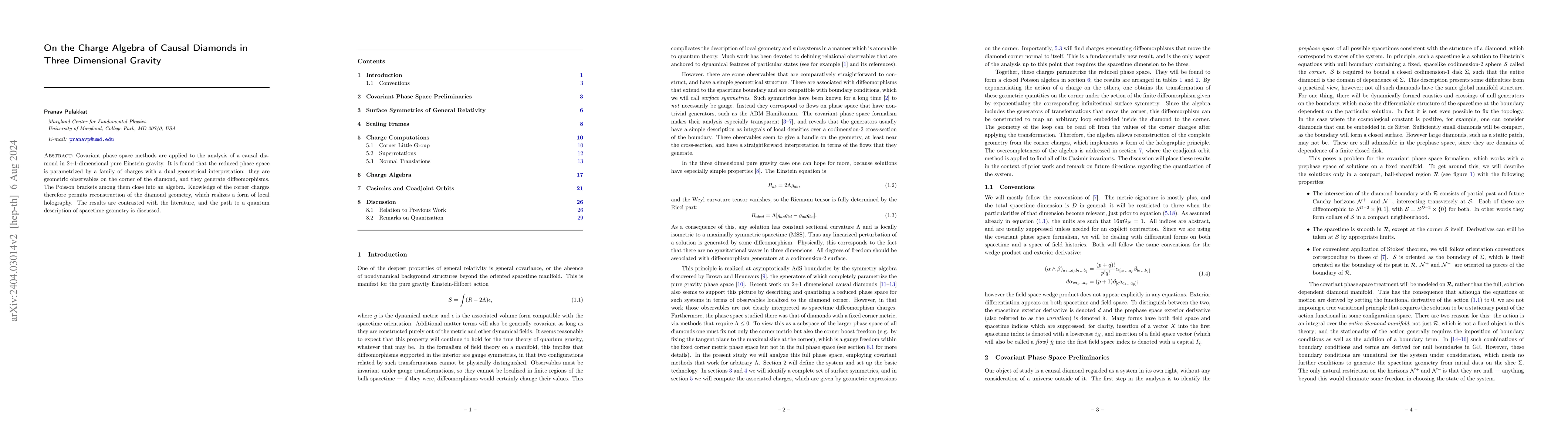 This paper uses covariant phase space methods to study charges in a causal diamond in 2+1-dimensional gravity, finding they form a charge algebra that geometrically reconstructs diamond geometry and suggests local holography, setting a stage for quantum spacetime geometry discussions.