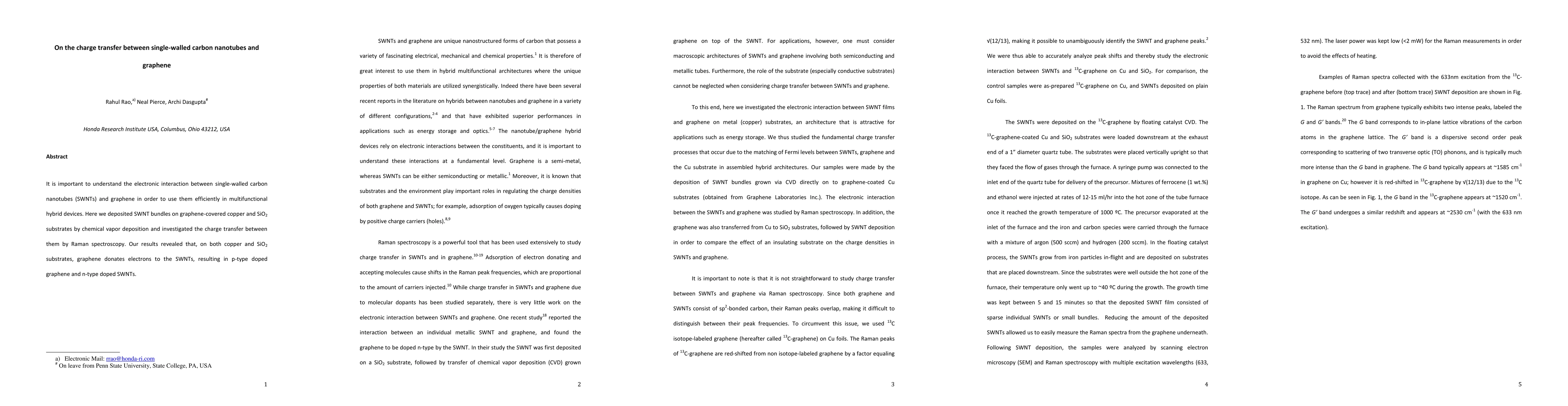 Summary: The study investigates charge transfer between single-walled carbon nanotubes (SWNTs) and graphene using chemical vapor deposition, revealing that graphene donates electrons to SWNTs, leading to p-type doped graphene and n-type doped SWNTs on both copper and SiO2 substrates.