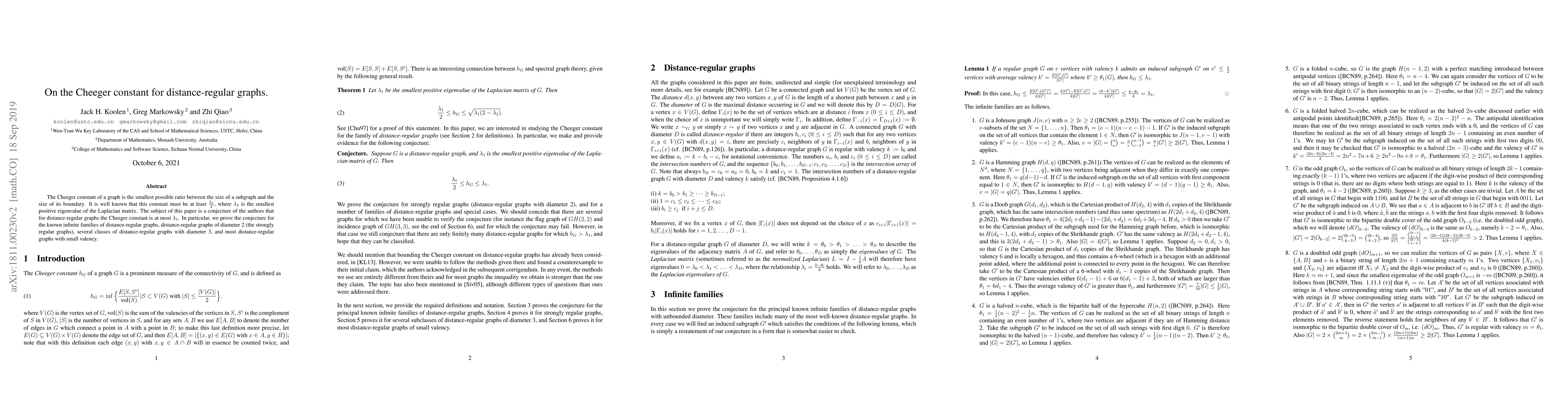 This paper investigates the conjecture that for distance-regular graphs, the Cheeger constant is at most the smallest positive eigenvalue of the Laplacian matrix ($\lambda_1$). The authors prove this conjecture for several classes of distance-regular graphs, including strongly regular graphs, imprimitive distance-regular graphs, and those with small valency.