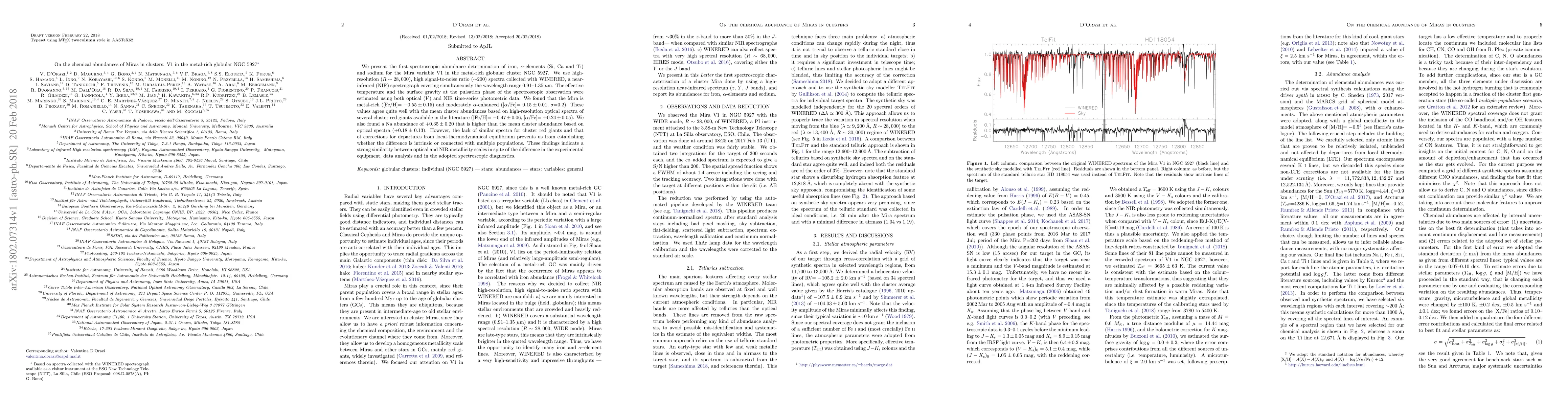 We present the first spectroscopic abundance determination of iron, alpha-elements (Si, Ca and Ti) and sodium for the Mira variable V1 in the metal-rich globular cluster NGC 5927. We use high-resolution (R~ 28,000), high signal-to-noise ratio (~200) spectra collected with WINERED, a near-infrared (NIR) spectrograph covering simultaneously the wavelength range 0.91--1.35 micron. The effective temperature and the surface gravity at the pulsation phase of the spectroscopic observation were estimated using both optical (V) and NIR time-series photometric data. We found that the Mira is metal-rich ([Fe/H]=-0.55 \pm 0.15) and moderately alpha-enhanced ([alpha/Fe]=0.15 \pm 0.01, sigma=0.2). These values agree quite well with the mean cluster abundances based on high-resolution optical spectra of several cluster red giants available in the literature ([Fe/H]=-0.47 \pm 0.06, [alpha/Fe]=+0.24 \pm 0.05). We also found a Na abundance of +0.35 \pm 0.20 that is higher than the mean cluster abundance based on optical spectra (+0.18 \pm 0.13). However, the lack of similar spectra for cluster red giants and that of corrections for departures from local-thermodynamical equilibrium prevents us from establishing whether the difference is intrinsic or connected with multiple populations. These findings indicate a strong similarity between optical and NIR metallicity scales in spite of the difference in the experimental equipment, data analysis and in the adopted spectroscopic diagnostics.