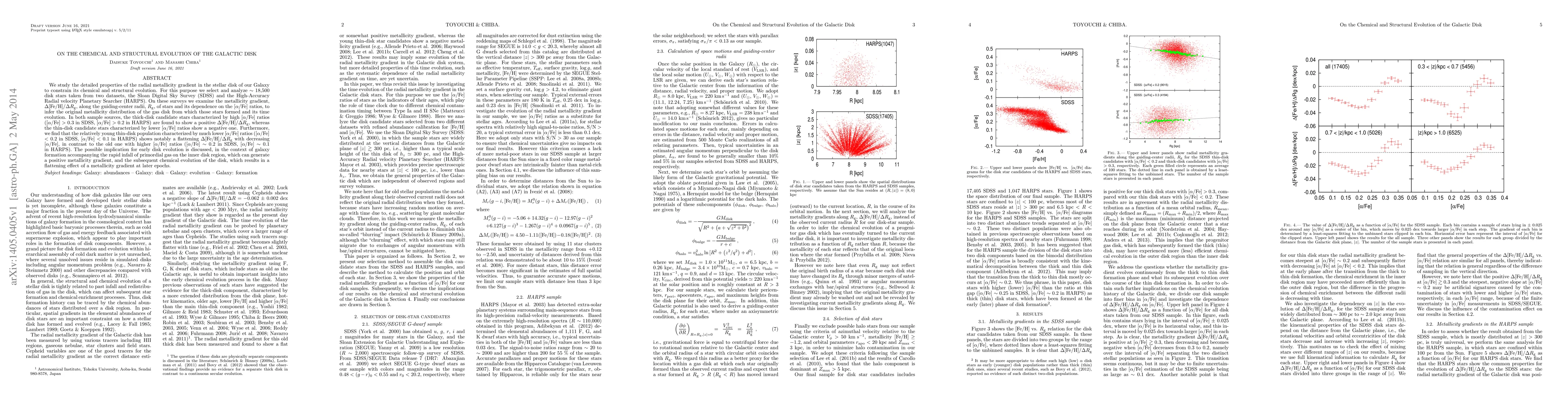 We study the detailed properties of the radial metallicity gradient in the stellar disk of our Galaxy to constrain its chemical and structural evolution. For this purpose we select and analyze $\sim$ 18,500 disk stars taken from two datasets, the Sloan Digital Sky Survey (SDSS) and the High-Accuracy Radial velocity Planetary Searcher (HARPS). On these surveys we examine the metallicity gradient, $\Delta$[Fe/H]/$\Delta R_{\rm g}$, along the guiding-center radii, $R_{\rm g}$, of stars and its dependence on the [$\alpha$/Fe] ratios, to infer the original metallicity distribution of the gas disk from which those stars formed and its time evolution. In both sample sources, the thick-disk candidate stars characterized by high [$\alpha$/Fe] ratios ([$\alpha$/Fe] $>$ 0.3 in SDSS, [$\alpha$/Fe] $>$ 0.2 in HARPS) are found to show a positive $\Delta$[Fe/H]/$\Delta R_{\rm g}$, whereas the thin-disk candidate stars characterized by lower [$\alpha$/Fe] ratios show a negative one. Furthermore, we find that the relatively young thin-disk population characterized by much lower [$\alpha$/Fe] ratios ([$\alpha$/Fe] $<$ 0.2 in SDSS, [$\alpha$/Fe] $<$ 0.1 in HARPS) shows notably a flattening $\Delta$[Fe/H]/$\Delta R_{\rm g}$ with decreasing [$\alpha$/Fe], in contrast to the old one with higher [$\alpha$/Fe] ratios ([$\alpha$/Fe] $\sim$ 0.2 in SDSS, [$\alpha$/Fe] $\sim$ 0.1 in HARPS). The possible implication for early disk evolution is discussed, in the context of galaxy formation accompanying the rapid infall of primordial gas on the inner disk region, which can generate a positive metallicity gradient, and the subsequent chemical evolution of the disk, which results in a flattening effect of a metallicity gradient at later epochs.