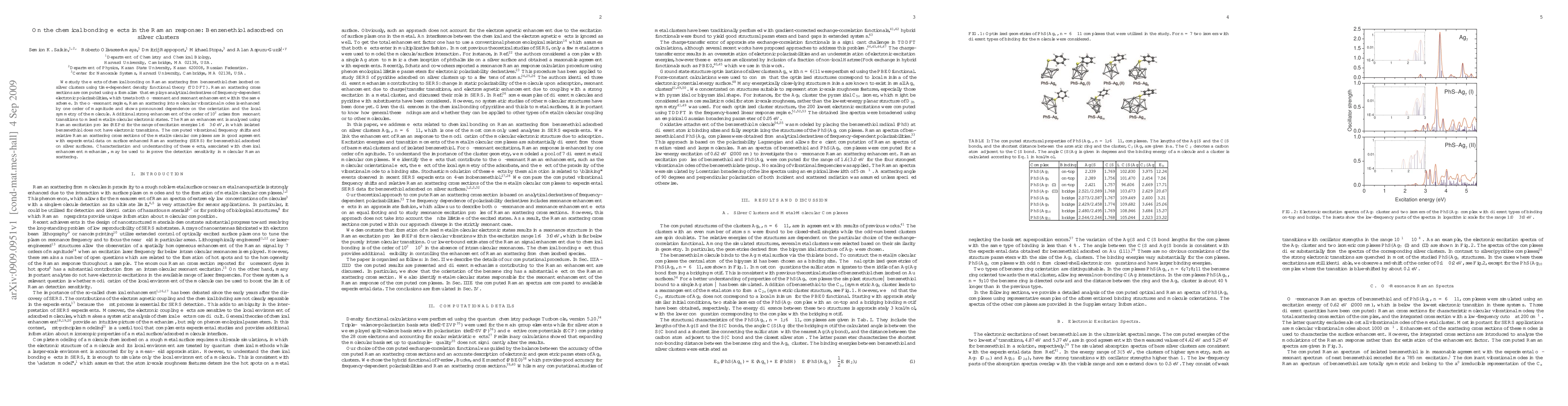 We study the effects of chemical bonding on Raman scattering from benzenethiol chemisorbed on silver clusters using time-dependent density functional theory (TDDFT). Raman scattering cross sections are computed using a formalism that employs analytical derivatives of frequency-dependent electronic polarizabilities, which treats both off-resonant and resonant enhancement within the same scheme. In the off-resonant regime, Raman scattering into molecular vibrational modes is enhanced by one order of magnitude and shows pronounced dependence on the orientation and the local symmetry of the molecule. Additional strong enhancement of the order of $10^2$ arises from resonant transitions to mixed metal--molecular electronic states. The Raman enhancement is analyzed using Raman excitation profiles (REPs) for the range of excitation energies $1.6-3.0$ eV, in which isolated benzenethiol does not have electronic transitions. The computed vibrational frequency shifts and relative Raman scattering cross sections of the metal--molecular complexes are in good agreement with experimental data on surface enhanced Raman scattering (SERS) for benzenethiol adsorbed on silver surfaces. Characterization and understanding of these effects, associated with chemical enhancement mechanism, may be used to improve the detection sensitivity in molecular Raman scattering.
