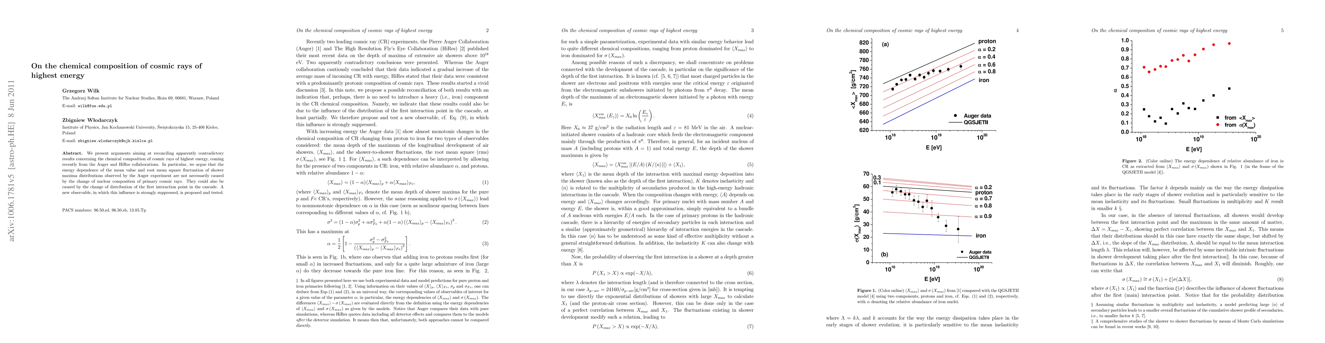We present arguments aiming at reconciling apparently contradictory results concerning the chemical composition of cosmic rays of highest energy, coming recently from the Auger and HiRes collaborations. In particular, we argue that the energy dependence of the mean value and root mean square fluctuation of shower maxima distributions observed by the Auger experiment are not necessarily caused by the change of nuclear composition of primary cosmic rays. They could also be caused by the change of distribution of the first interaction point in the cascade. A new observable, in which this influence is strongly suppressed, is proposed and tested.