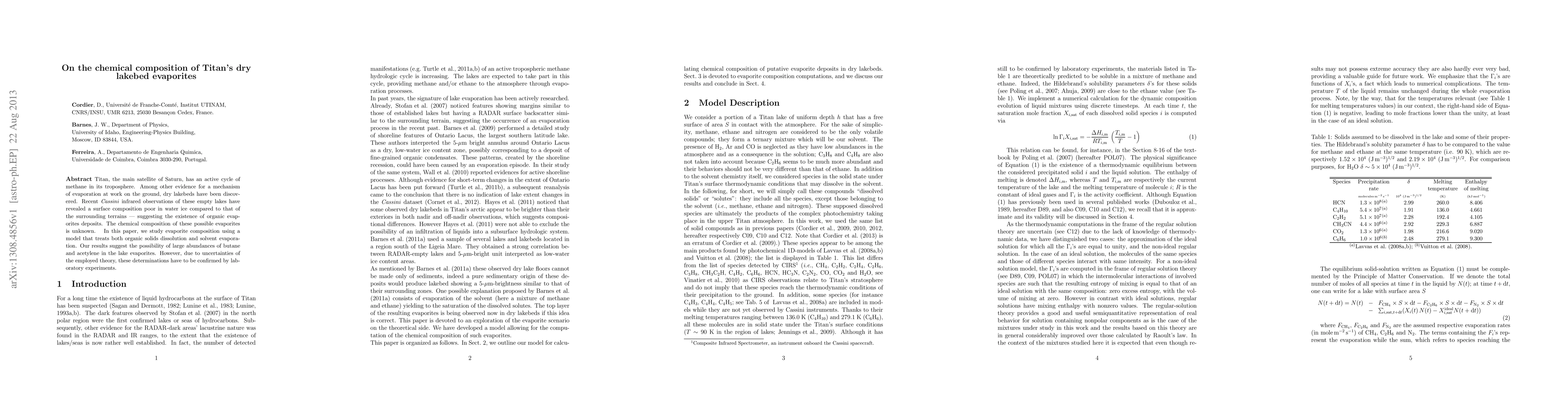 Titan, the main satellite of Saturn, has an active cycle of methane in its troposphere. Among other evidence for a mechanism of evaporation at work on the ground, dry lakebeds have been discovered. Recent Cassini infrared observations of these empty lakes have revealed a surface composition poor in water ice compared to that of the surrounding terrains --- suggesting the existence of organic evaporites deposits. The chemical composition of these possible evaporites is unknown. In this paper, we study evaporite composition using a model that treats both organic solids dissolution and solvent evaporation. Our results suggest the possibility of large abundances of butane and acetylene in the lake evaporites. However, due to uncertainties of the employed theory, these determinations have to be confirmed by laboratory experiments.