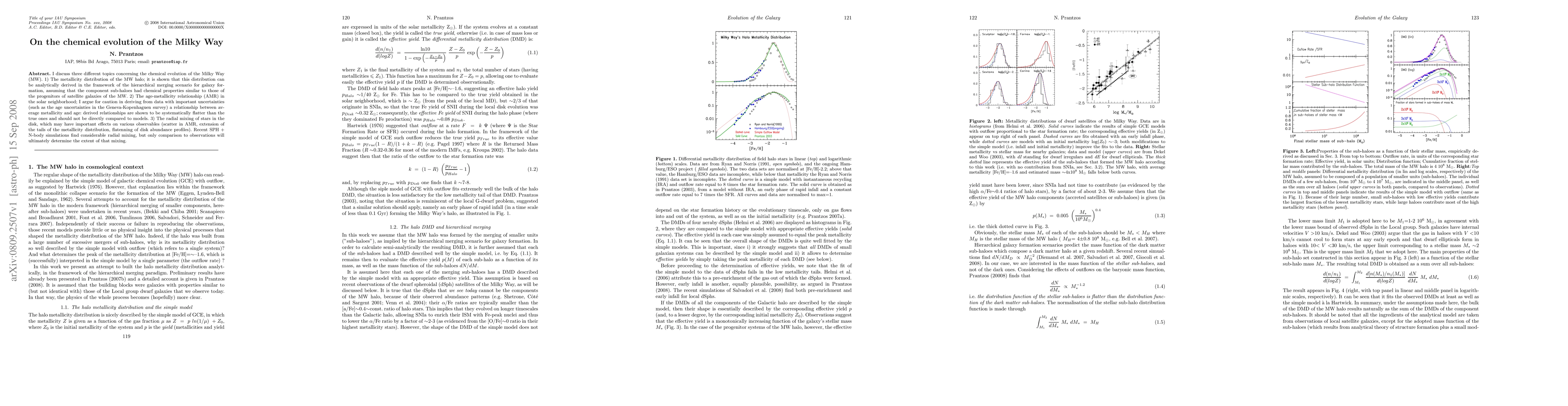 I discuss three different topics concerning the chemical evolution of the Milky Way (MW). 1) The metallicity distribution of the MW halo; it is shown that this distribution can be analytically derived in the framework of the hierarchical merging scenario for galaxy formation, assuming that the component sub-haloes had chemical properties similar to those of the progenitors of satellite galaxies of the MW. 2) The age-metallicity relationship (AMR) in the solar neighborhood; I argue for caution in deriving from data with important uncertainties (such as the age uncertainties in the Geneva-Kopenhaguen survey) a relationship between average metallicity and age: derived relationships are shown to be systematically flatter than the true ones and should not be directly compared to models. 3) The radial mixing of stars in the disk, which may have important effects on various observables (scatter in AMR, extension of the tails of the metallicity distribution, flatenning of disk abundance profiles). Recent SPH + N-body simulations find considerable radial mixing, but only comparison to observations will ultimately determine the extent of that mixing.