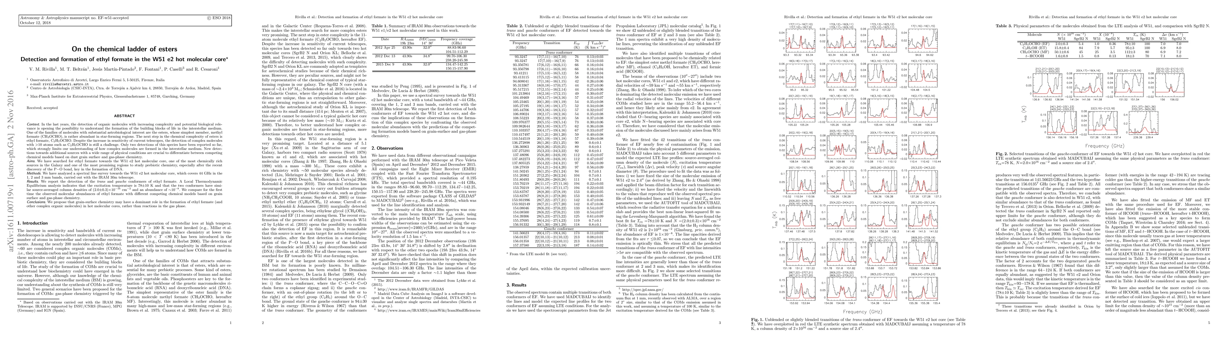 The detection of organic molecules with increasing complexity and potential biological relevance is opening the possibility to understand the formation of the building blocks of life in the interstellar medium. One of the families of molecules with astrobiological interest are the esters, whose simplest member, methyl formate, is rather abundant in star-forming regions. The next step in the chemical complexity of esters is ethyl formate, C$_2$H$_5$OCHO. Only two detections of this species have been reported so far, which strongly limits our understanding of how complex molecules are formed in the interstellar medium. We have searched for ethyl formate towards the W51 e2 hot molecular core, one of the most chemically rich sources in the Galaxy and one of the most promising regions to study prebiotic chemistry, especially after the recent discovery of the P$-$O bond, key in the formation of DNA. We have analyzed a spectral line survey towards the W51 e2 hot molecular core, which covers 44 GHz in the 1, 2 and 3 mm bands, carried out with the IRAM 30m telescope. We report the detection of the trans and gauche conformers of ethyl formate. A Local Thermodynamic Equilibrium analysis indicates that the excitation temperature is 78$\pm$10 K and that the two conformers have similar source-averaged column densities of (2.0$\pm$0.3)$\times$10$^{16}$ cm$^{-2}$ and an abundance of $\sim$10$^{-8}$. We compare the observed molecular abundances of ethyl formate with different competing chemical models based on grain surface and gas-phase chemistry. We propose that grain-surface chemistry may have a dominant role in the formation of ethyl formate (and other complex organic molecules) in hot molecular cores, rather than reactions in the gas phase.