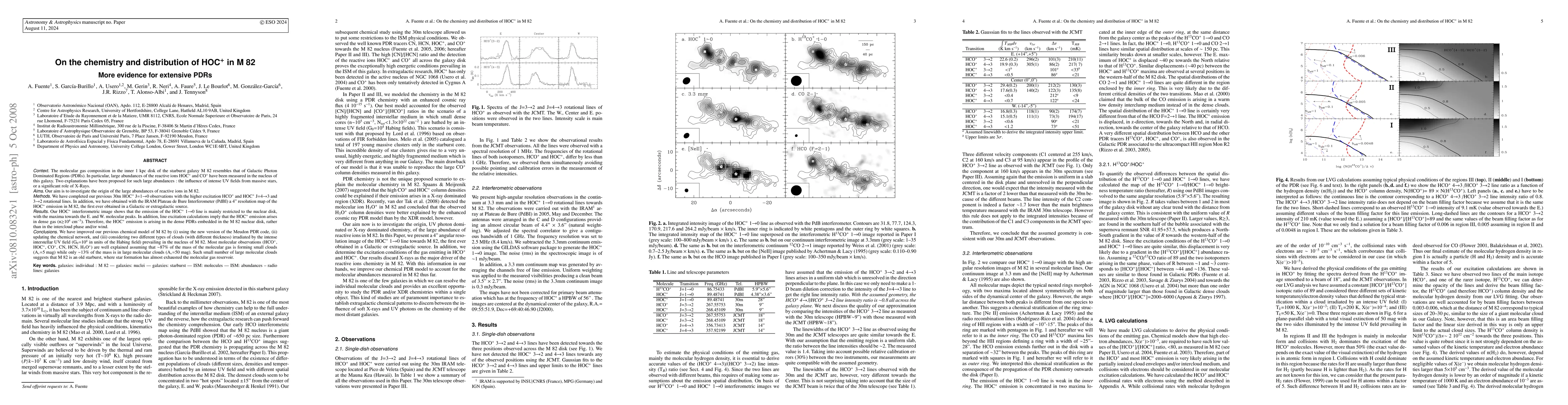 This research investigates the chemistry and distribution of HOC+ in M82, revealing extensive Photon Dominated Regions (PDRs) in the starburst galaxy. Observations show HOC+ emission concentrated in the nuclear disk, indicating its origin in dense PDRs rather than in the intercloud phase or wind.