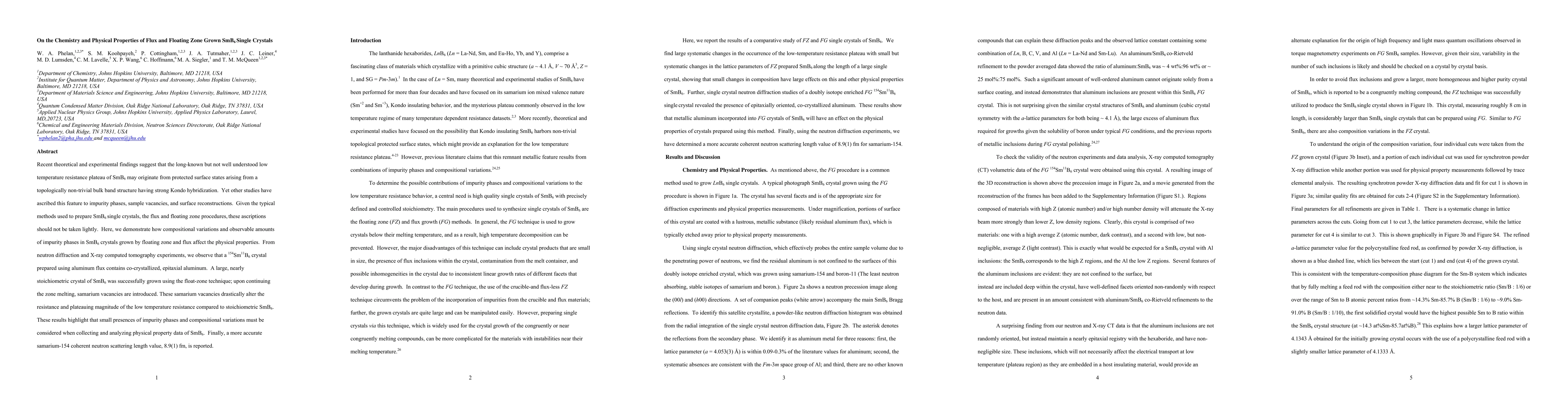 Recent theoretical and experimental findings suggest that the long-known but not well understood low temperature resistance plateau of SmB6 may originate from protected surface states arising from a topologically non-trivial bulk band structure having strong Kondo hybridization. Yet other studies have ascribed this feature to impurity phases, sample vacancies, and surface reconstructions. Given the typical methods used to prepare SmB6 single crystals, the flux and floating zone procedures, these ascriptions should not be taken lightly. Here, we demonstrate how compositional variations and observable amounts of impurity phases in SmB6 crystals grown by floating zone and flux affect the physical properties. From neutron diffraction and X-ray computed tomography experiments, we observe that a 154Sm11B6 crystal prepared using aluminum flux contains co-crystallized, epitaxial aluminum. A large, nearly stoichiometric crystal of SmB6 was successfully grown using the float-zone technique; upon continuing the zone melting, samarium vacancies are introduced. These samarium vacancies drastically alter the resistance and plateauing magnitude of the low temperature resistance compared to stoichiometric SmB6. These results highlight that small presences of impurity phases and compositional variations must be considered when collecting and analyzing physical property data of SmB6. Finally, a more accurate samarium-154 coherent neutron scattering length value, 8.9(1) fm, is reported.