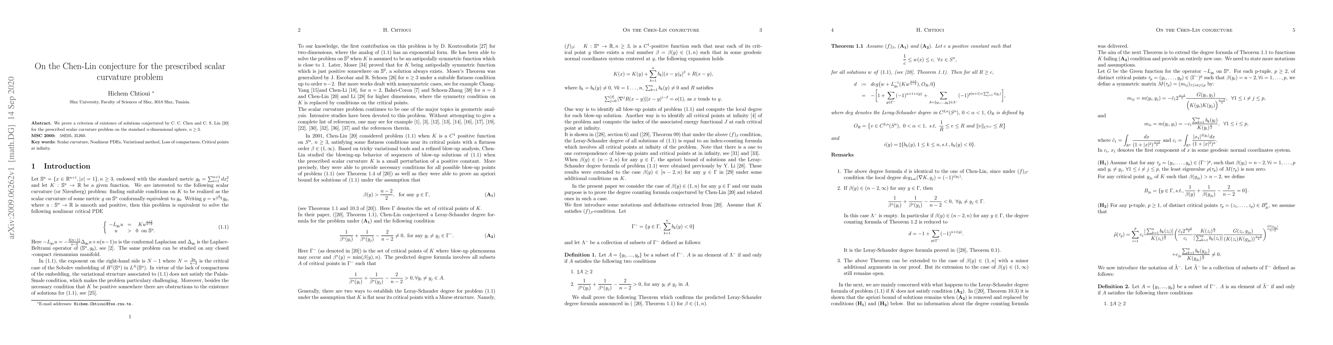 This paper proves the existence criterion for solutions to the Chen-Lin conjecture regarding the prescribed scalar curvature problem on the standard n-dimensional sphere. The authors validate the conjecture proposed by Chen and Lin.