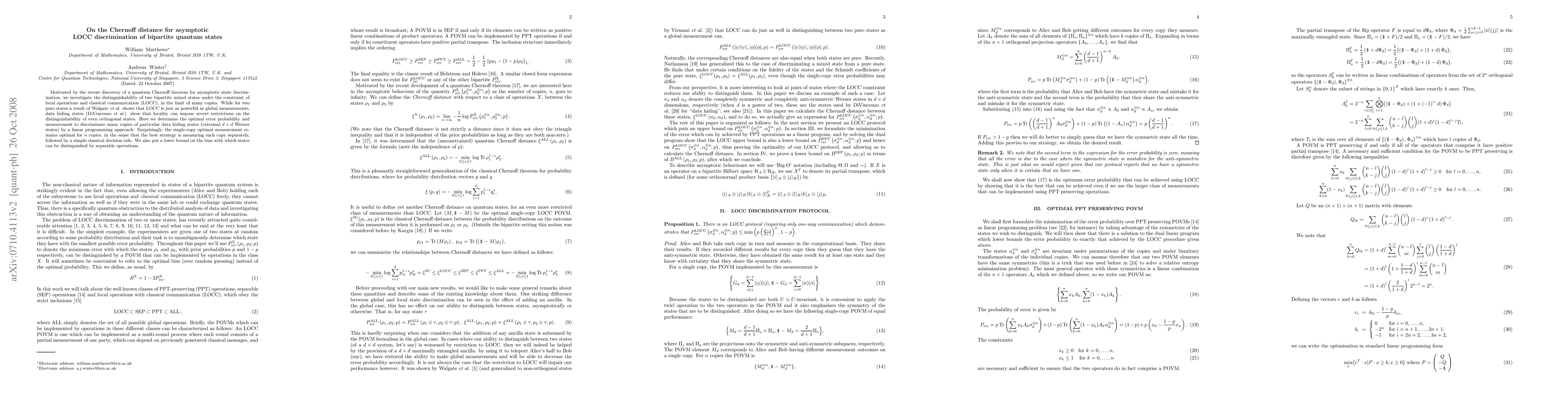 Motivated by the recent discovery of a quantum Chernoff theorem for asymptotic state discrimination, we investigate the distinguishability of two bipartite mixed states under the constraint of local operations and classical communication (LOCC), in the limit of many copies. While for two pure states a result of Walgate et al. shows that LOCC is just as powerful as global measurements, data hiding states (DiVincenzo et al.) show that locality can impose severe restrictions on the distinguishability of even orthogonal states. Here we determine the optimal error probability and measurement to discriminate many copies of particular data hiding states (extremal d x d Werner states) by a linear programming approach. Surprisingly, the single-copy optimal measurement remains optimal for n copies, in the sense that the best strategy is measuring each copy separately, followed by a simple classical decision rule. We also put a lower bound on the bias with which states can be distinguished by separable operations.