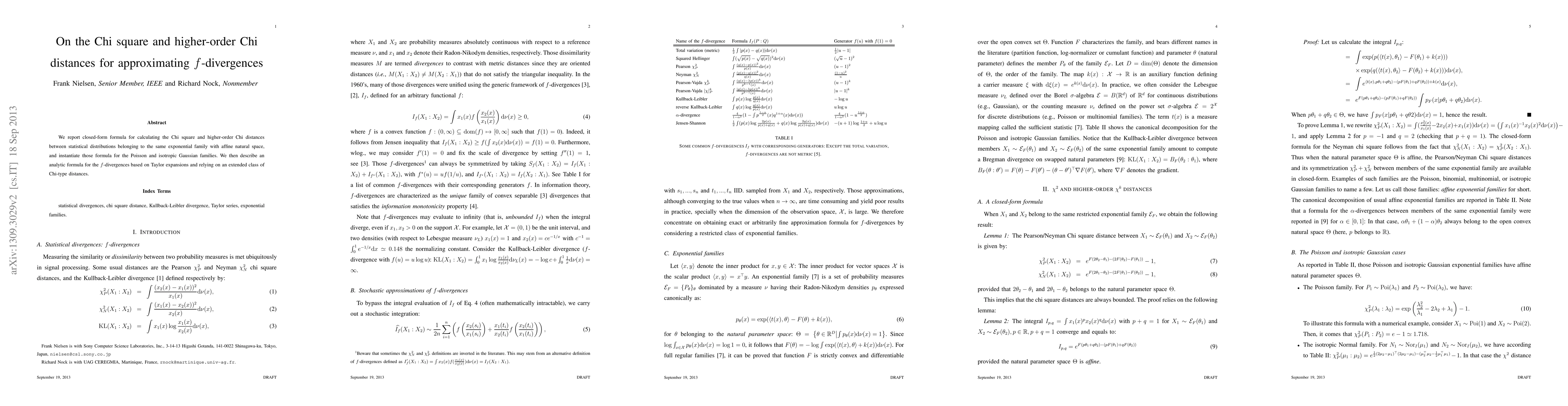 This paper presents closed-form formulas for calculating Chi square and higher-order Chi distances for distributions within the same exponential family, specifically for Poisson and isotropic Gaussian distributions. It also introduces an analytic formula for $f$-divergences based on Taylor expansions using an extended class of Chi-type distances.