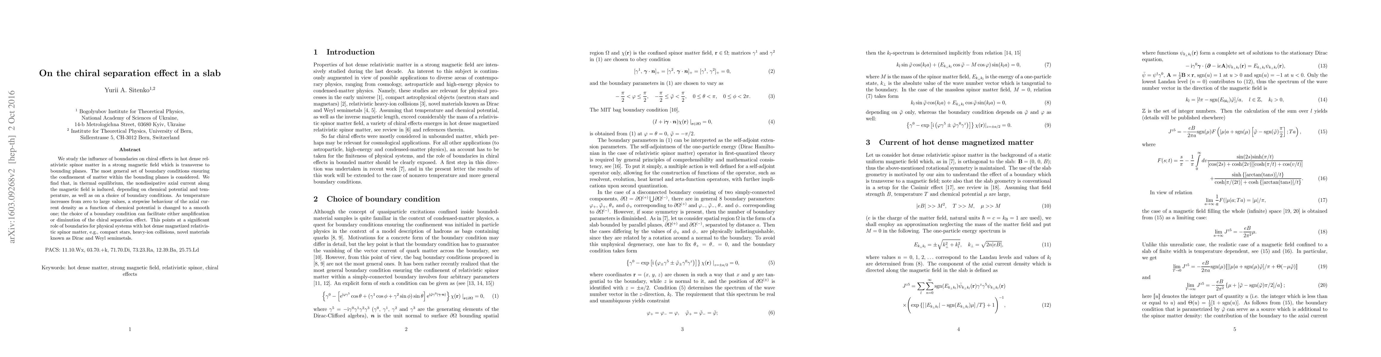 We study the influence of boundaries on chiral effects in hot dense relativistic spinor matter in a strong magnetic field which is transverse to bounding planes. The most general set of boundary conditions ensuring the confinement of matter within the bounding planes is considered. We find that, in thermal equilibrium, the nondissipative axial current along the magnetic field is induced, depending on chemical potential and temperature, as well as on a choice of boundary conditions. As temperature increases from zero to large values, a stepwise behaviour of the axial current density as a function of chemical potential is changed to a smooth one; the choice of a boundary condition can facilitate either amplification or diminution of the chiral separation effect. This points at a significant role of boundaries for physical systems with hot dense magnetized relativistic spinor matter, e.g., compact stars, heavy-ion collisions, novel materials known as Dirac and Weyl semimetals.