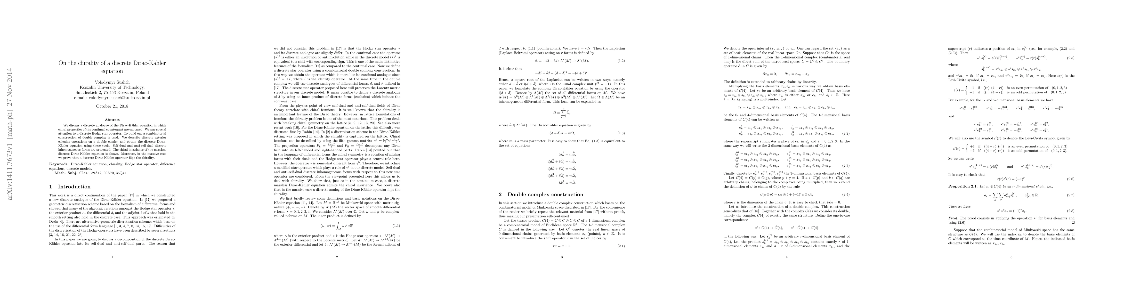 This paper develops a discrete analogue of the Dirac-Kähler equation, focusing on capturing chiral properties through a combinatorial construction of a double complex and discrete exterior calculus operations. The study demonstrates chiral invariance in the massless case and chirality flipping in the massive case.