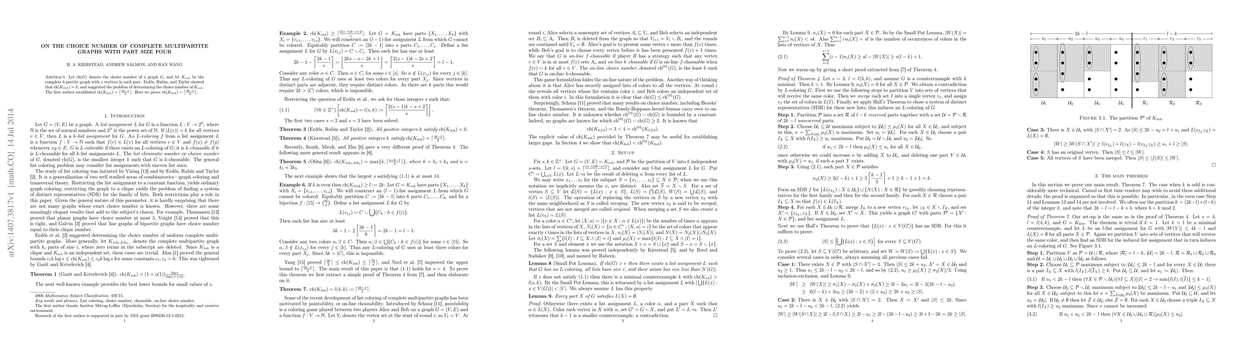 Let $\mathrm{ch}(G)$ denote the choice number of a graph $G$, and let $K_{s*k}$ be the complete $k$-partite graph with $s$ vertices in each part. Erd\H{o}s, Rubin, and Taylor showed that $\mathrm{ch}( K_{2*k})=k$, and suggested the problem of determining the choice number of $K_{s*k}.$ The first author established $\mathrm{ch}( K_{3*k})=\left\lceil \frac{4k-1}{3}\right\rceil$. Here we prove $\mathrm{ch} (K_{4*k})=\left\lceil \frac{3k-1}{2}\right\rceil$.