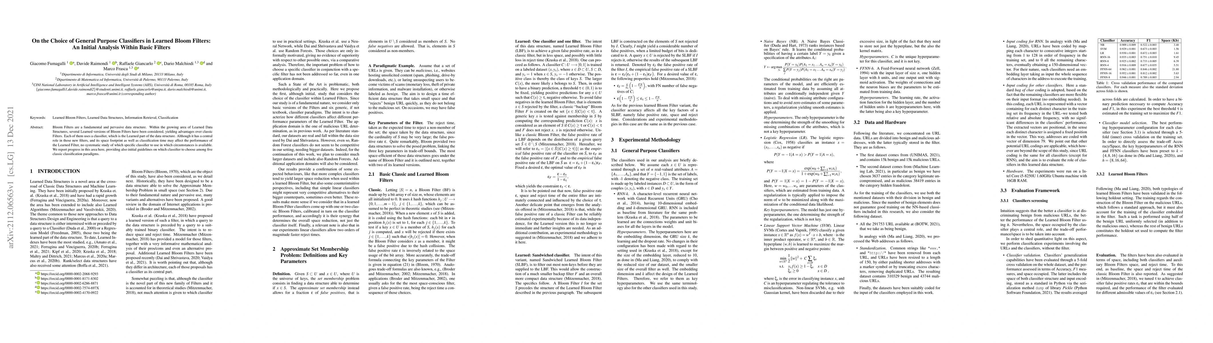 This research investigates the selection of general-purpose classifiers in Learned Bloom Filters, highlighting the lack of systematic studies on optimal classifier choice. Initial guidelines for choosing among five classic classification paradigms are provided.