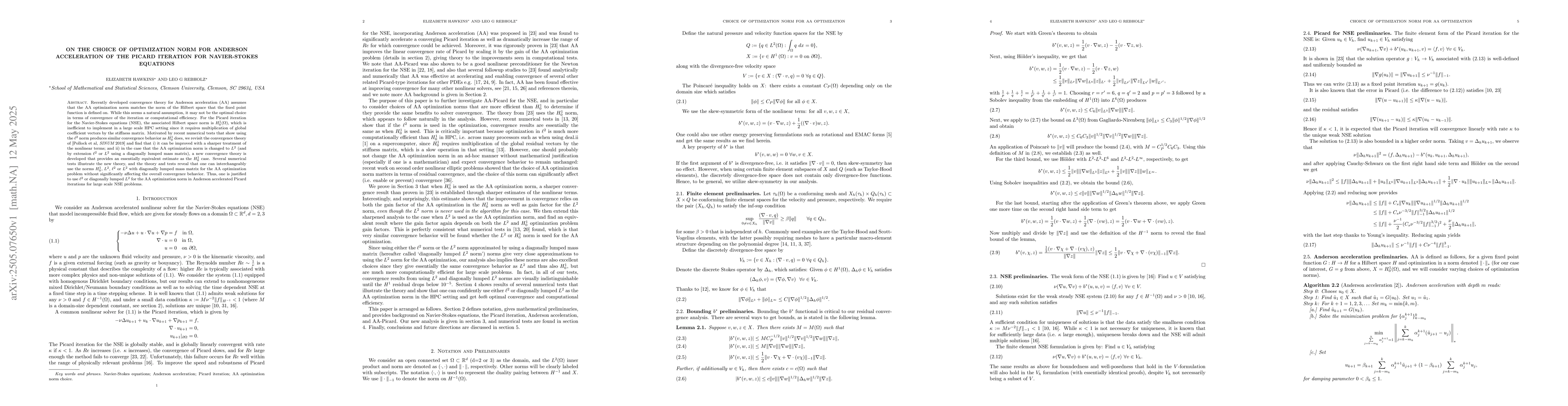 The research revisits the convergence theory for Anderson acceleration (AA) of Picard iteration for Navier-Stokes equations, focusing on the choice of optimization norm.