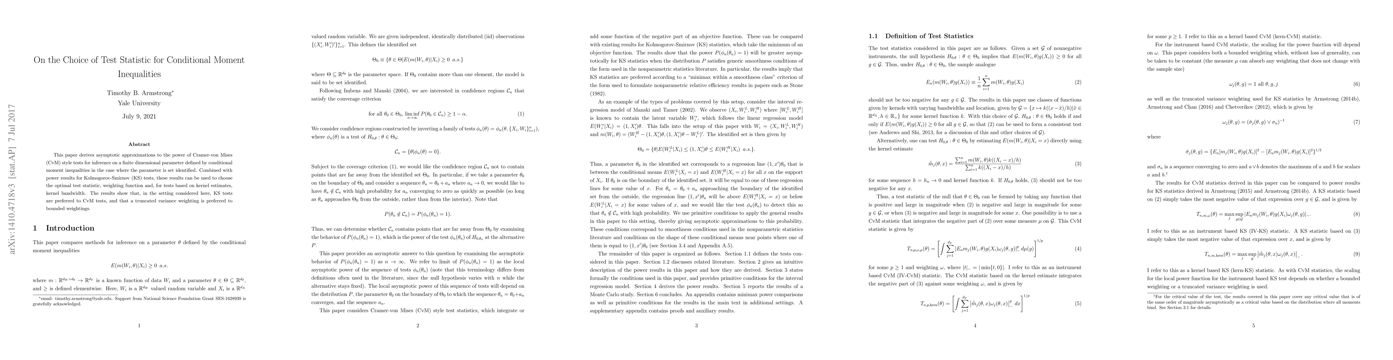 This paper compares the power of Cramer-von Mises and Kolmogorov-Smirnov tests for conditional moment inequalities, finding that Kolmogorov-Smirnov tests are more effective, especially with a truncated variance weighting scheme.