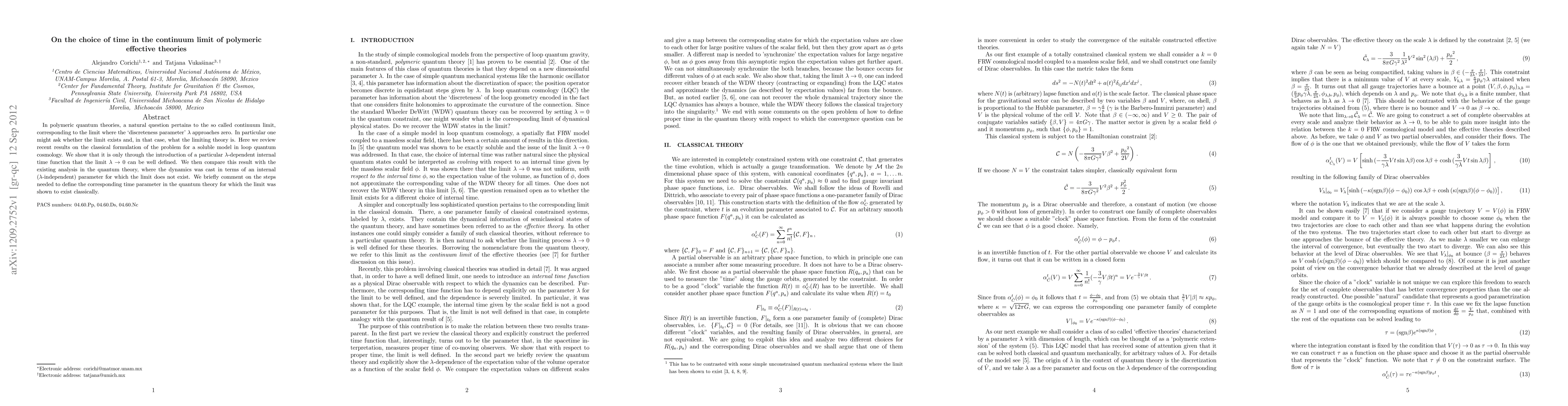In polymeric quantum theories, a natural question pertains to the so called continuum limit, corresponding to the limit where the `discreteness parameter' $\lambda$ approaches zero. In particular one might ask whether the limit exists and, in that case, what the limiting theory is. Here we review recent results on the classical formulation of the problem for a soluble model in loop quantum cosmology. We show that it is only through the introduction of a particular $\lambda$-dependent internal time function that the limit $\lambda\to 0$ can be well defined. We then compare this result with the existing analysis in the quantum theory, where the dynamics was cast in terms of an internal ($\lambda$-independent) parameter for which the limit does not exist. We briefly comment on the steps needed to define the corresponding time parameter in the quantum theory for which the limit was shown to exist classically.
