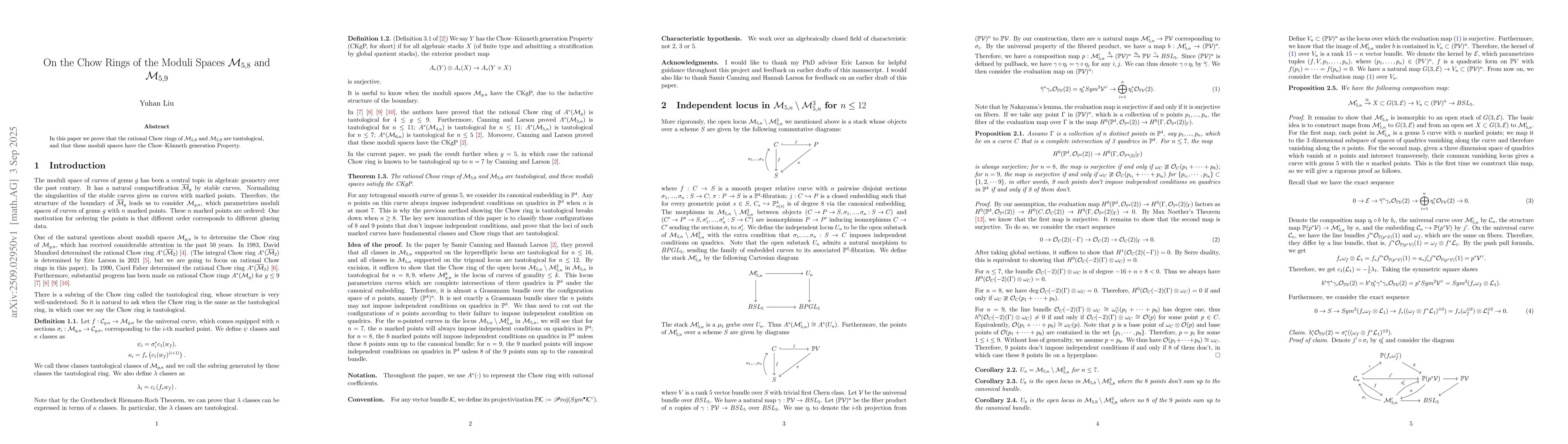 In this paper we prove that the rational Chow rings of $\mathcal{M}_{5,8}$ and $\mathcal{M}_{5,9}$ are tautological, and that these moduli spaces have the Chow K\"unneth generation Property.