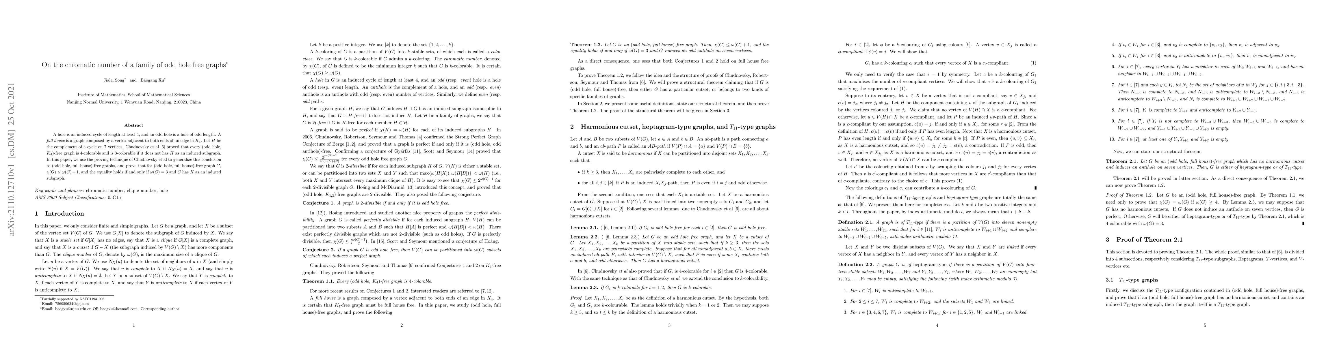 The paper uses a proving technique similar to Chudnovsky et al. to generalize conclusions about (odd hole, $K_4$)-free graphs to (odd hole, full house)-free graphs.