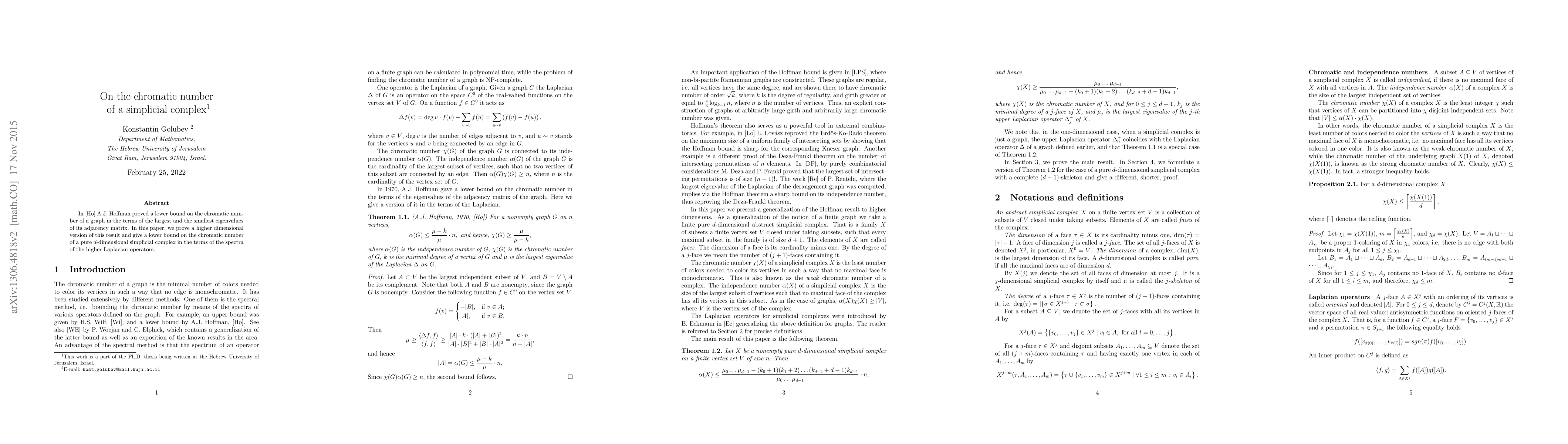 This paper extends Hoffman's lower bound on the chromatic number of a graph to pure $d$-dimensional simplicial complexes, using the spectra of higher Laplacian operators instead of the adjacency matrix. The result provides a new perspective on the chromatic number in higher dimensions.
