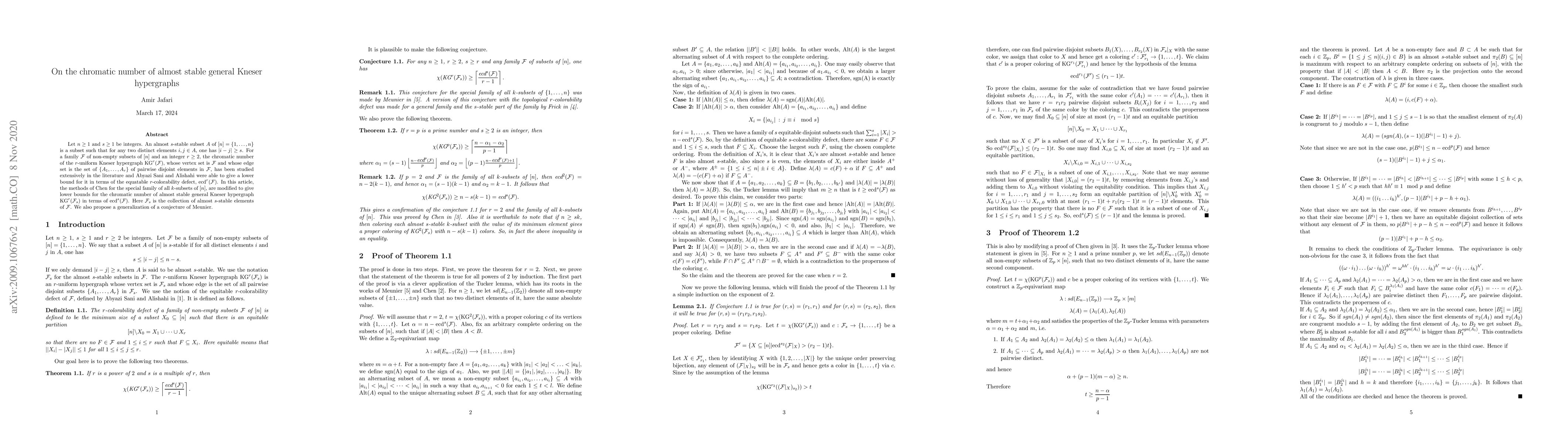 Let $n\ge 1$ and $s\ge 1$ be integers. An almost $s$-stable subset $A$ of $[n]=\{1,\dots,n\}$ is a subset such that for any two distinct elements $i, j\in A$, one has $|i-j|\ge s$. For a family $\cal F$ of non-empty subsets of $[n]$ and an integer $r\ge 2$, the chromatic number of the $r$-uniform Kneser hypergraph $\mbox{KG}^r({\cal F})$, whose vertex set is $\cal F$ and whose edge set is the set of $\{A_1,\dots, A_r\}$ of pairwise disjoint elements in $\cal F$, has been studied extensively in the literature and Abyazi Sani and Alishahi were able to give a lower bound for it in terms of the equatable $r$-colorability defect, $\mbox{ecd}^r({\cal F})$. In this article, the methods of Chen for the special family of all $k$-subsets of $[n]$, are modified to give lower bounds for the chromatic number of almost stable general Kneser hypergraph $\mbox{KG}^r({\cal F}_s)$ in terms of $\mbox{ecd}^s({\cal F})$. Here ${\cal F}_s$ is the collection of almost $s$-stable elements of $\cal F$. We also propose a generalization of a conjecture of Meunier.