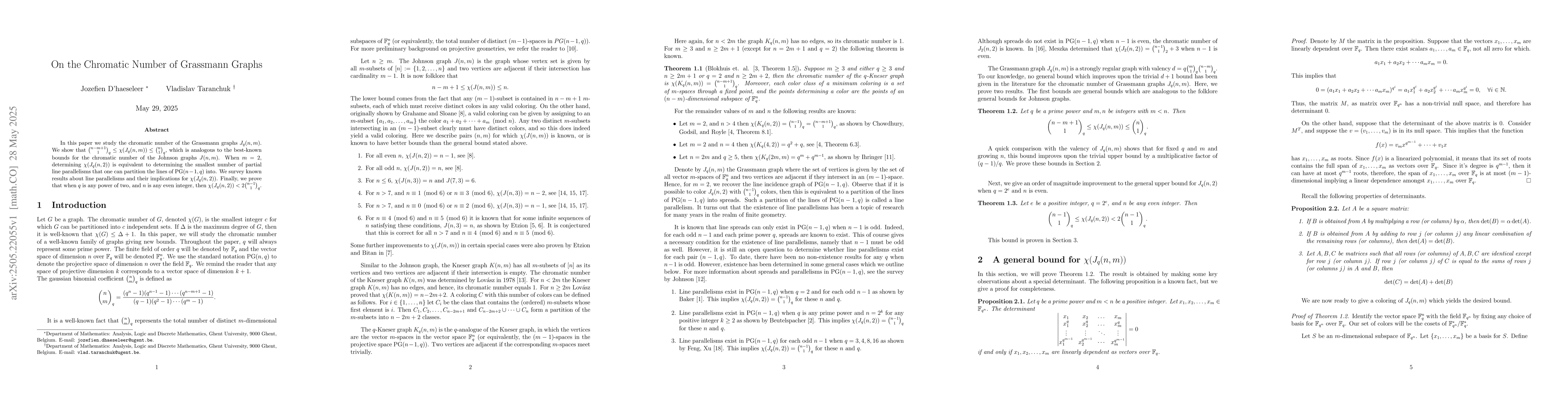 The paper presents new bounds for the chromatic number of Grassmann graphs and establishes a connection with line parallelisms in projective geometry.