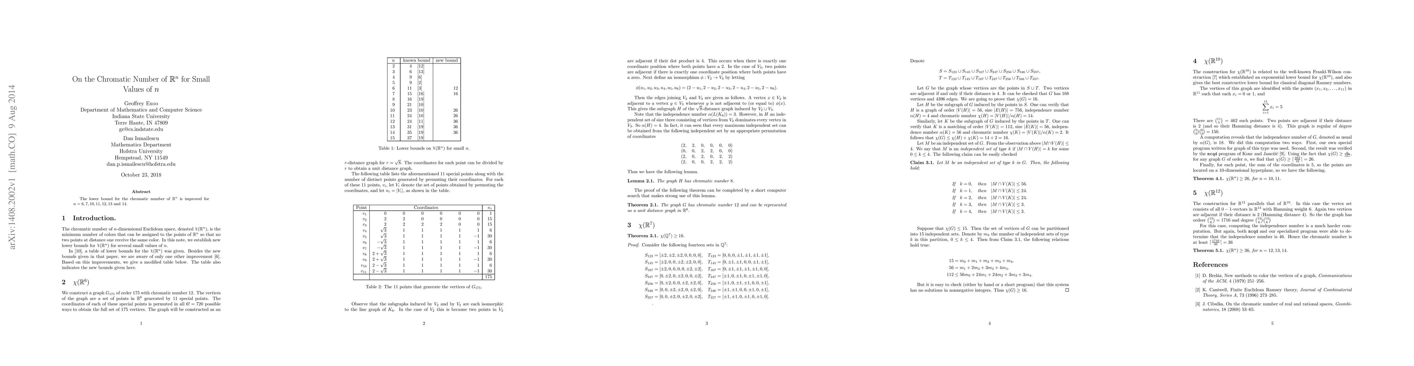 This paper improves the lower bound for the chromatic number of $\mathbb{R}^n$ for specific small values of $n$, specifically for $n = 6, 7, 10, 11, 12, 13$, and $14$. The findings provide new insights into the complexity of coloring spaces in these dimensions.