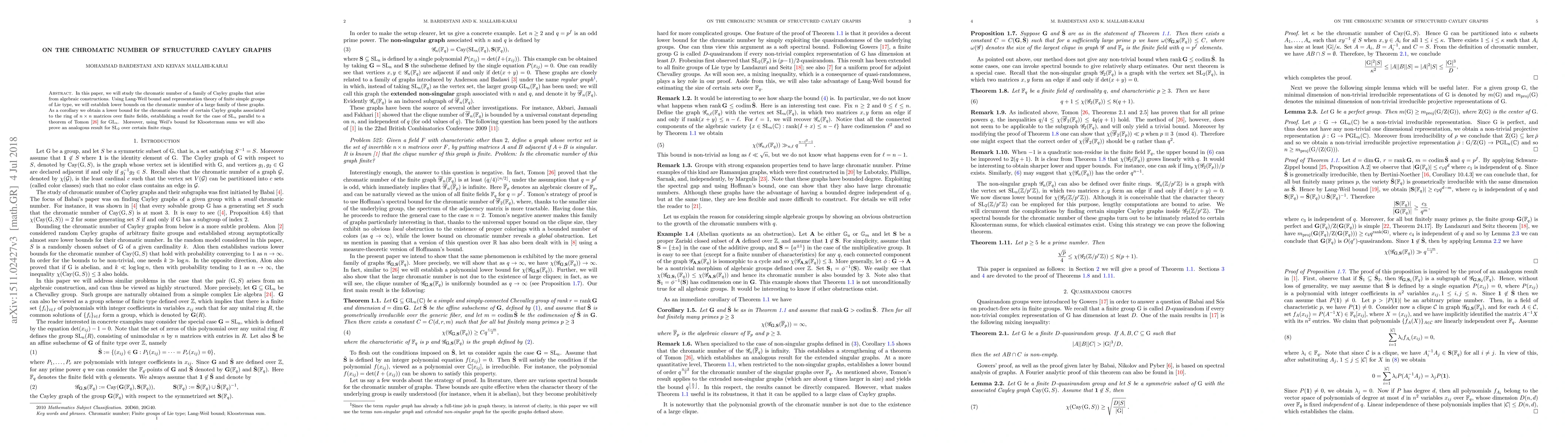 This paper investigates the chromatic number of Cayley graphs derived from algebraic groups, establishing lower bounds through Lang-Weil bounds and representation theory of finite simple groups. It also applies Weil's bound for Kloosterman sums to provide analogous results for $\mathrm{SL}_2$ over finite rings.