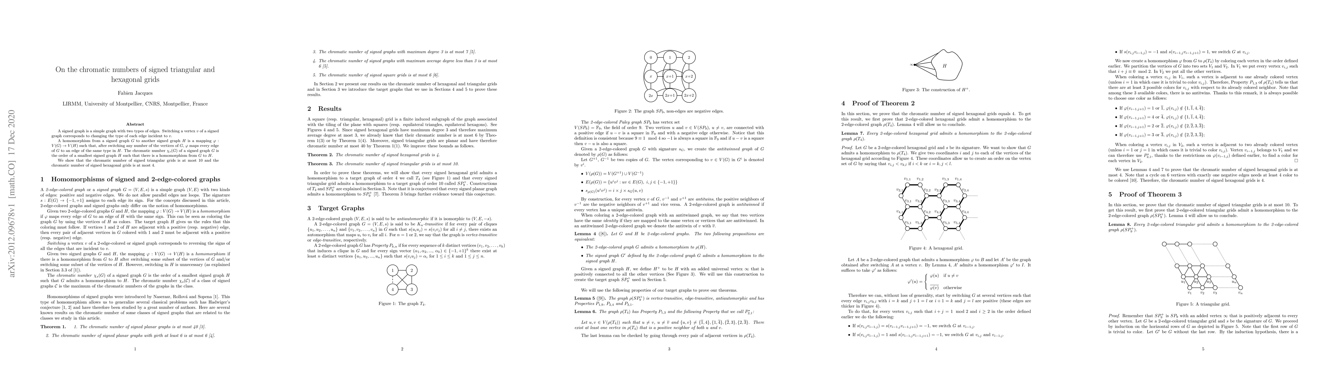 This paper explores signed graphs, which have two edge types, and introduces the concept of chromatic number for such graphs. The key findings are that the chromatic number of signed triangular grids is at most 10, and for signed hexagonal grids, it's at most 4. These results provide insights into the coloring complexity of these grid structures under signed edge constraints.