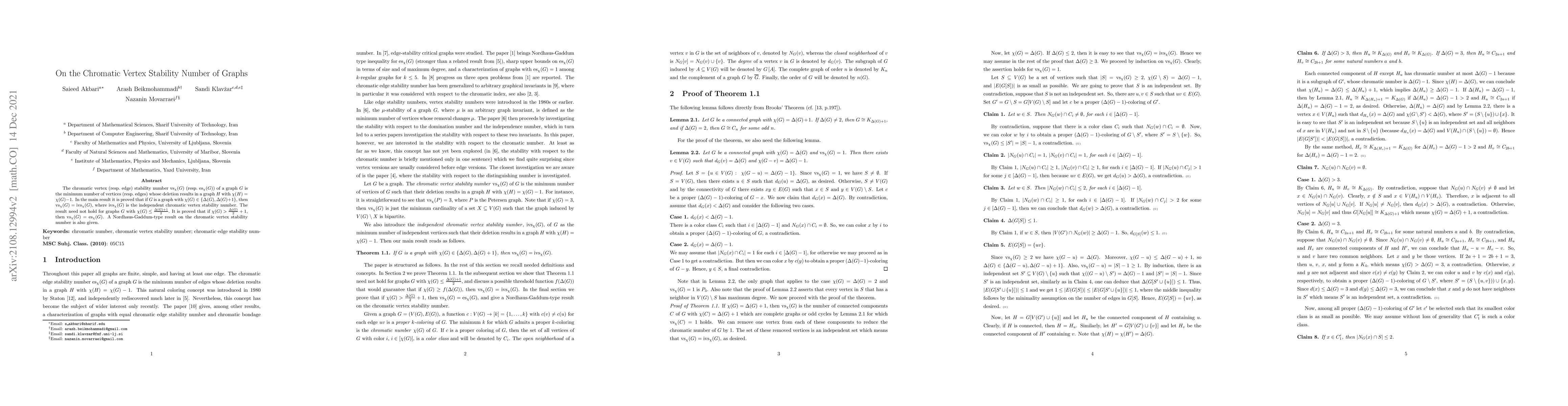The work extends previous research by proving conditions under which vertex and independent vertex stability numbers coincide and by introducing a Nordhaus-Gaddum-type result for the chromatic vertex stability number.