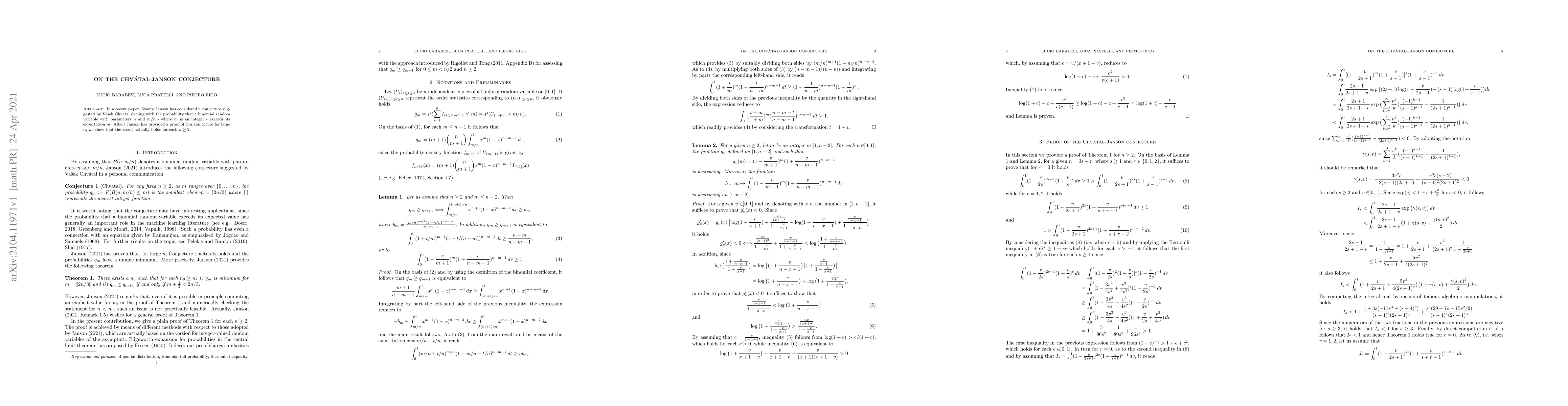 In a recent paper, Svante Janson has considered a conjecture suggested by Va\v{s}ek Chv\a'atal dealing with the probability that a binomial random variable with parameters $n$ and $m/n$ - where $m$ is an integer - exceeds its expectation $m$. Albeit Janson has provided a proof of this conjecture for large $n$, we show that the result actually holds for each $n\geq 2$.