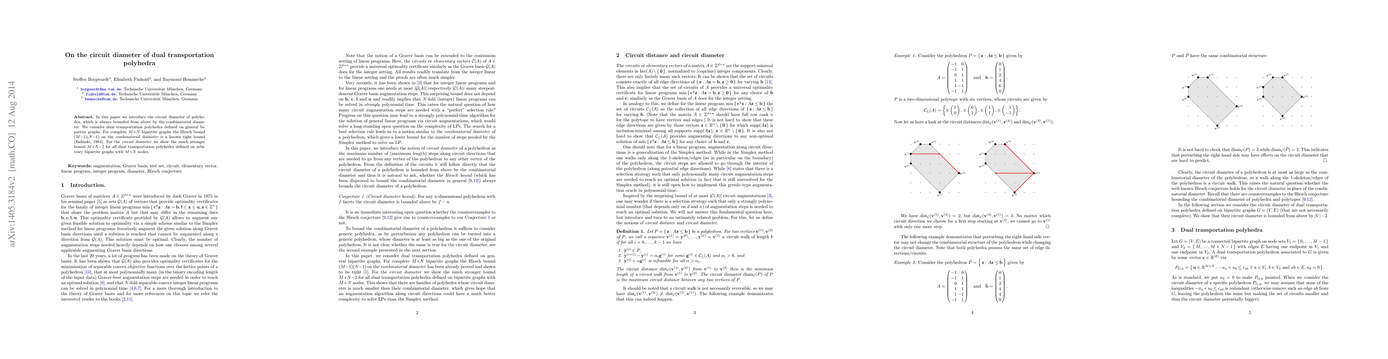 This paper introduces the concept of circuit diameter for polyhedra, showing it is bounded by the combinatorial diameter. It establishes a stronger bound of $M+N-2$ for the circuit diameter of dual transportation polyhedra on arbitrary bipartite graphs, contrasting with the Hirsch bound for combinatorial diameter on complete bipartite graphs.