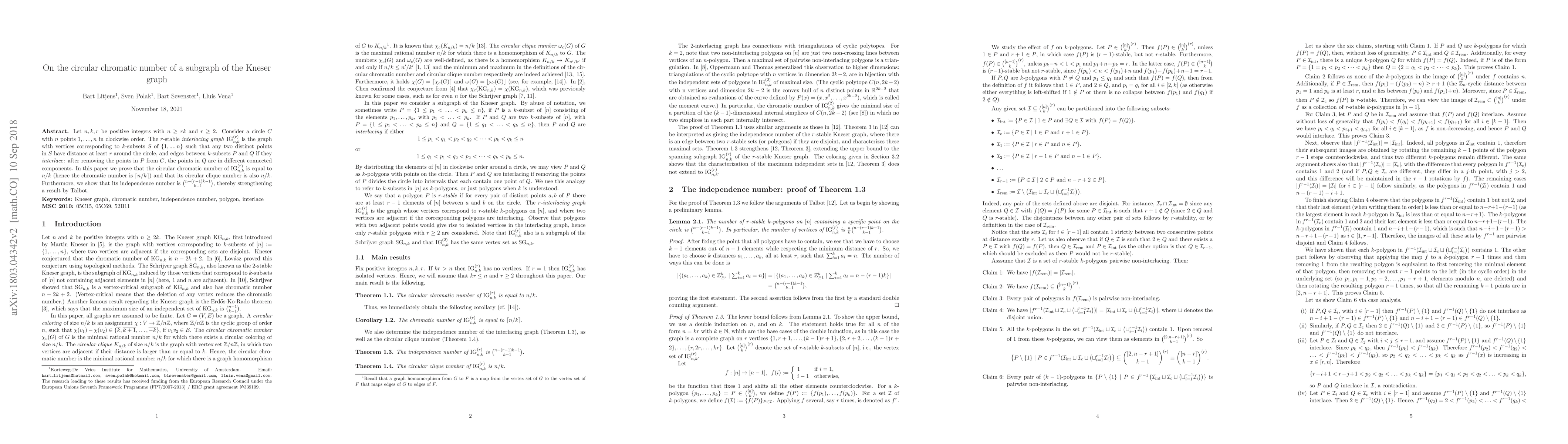 Let $n,k,r$ be positive integers with $n \geq rk$ and $r \geq 2$. Consider a circle $C$ with~$n$ points~$1,\ldots,n$ in clockwise order. The $r$-stable \emph{interlacing graph} $\text{IG}_{n,k}^{(r)}$ is the graph with vertices corresponding to $k$-subsets $S$ of $\{1,...,n\}$ such that any two distinct points in~$S$ have distance at least~$r$ around the circle, and edges between~$k$-subsets $P$ and $Q$ if they \emph{interlace}: after removing the points in~$P$ from $C$, the points in~$Q$ are in different connected components. In this paper we prove that the circular chromatic number of $\text{IG}_{n,k}^{(r)}$ is equal to $ n/k $ (hence the chromatic number is $\lceil n/k \rceil$) and that its circular clique number is also $ n/k $. Furthermore, we show that its independence number is $\binom{n-(r-1)k-1}{k-1}$, thereby strengthening a result by Talbot.