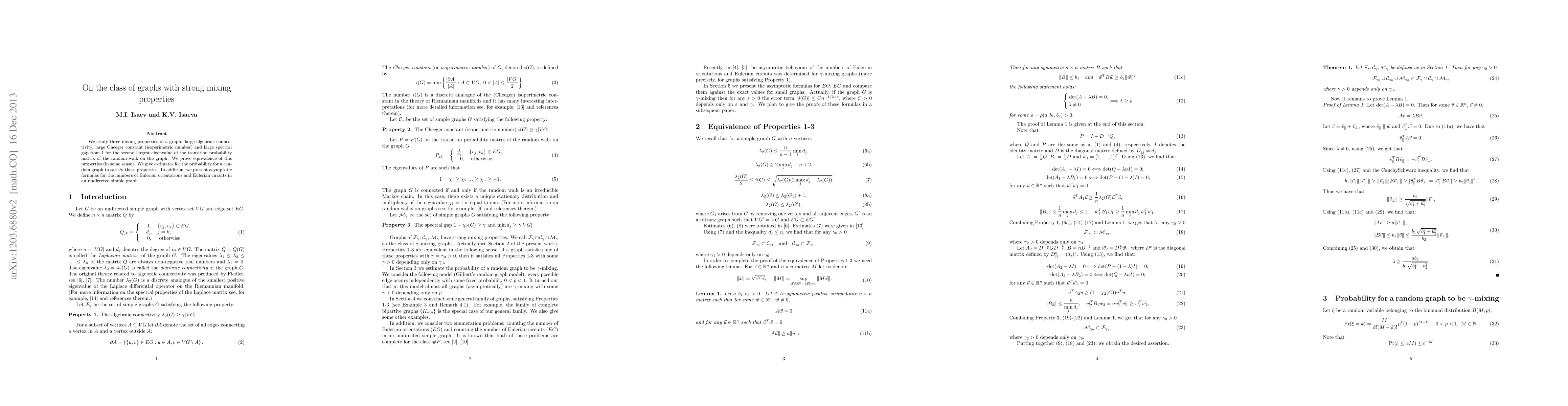 We study three mixing properties of a graph: large algebraic connectivity, large Cheeger constant (isoperimetric number) and large spectral gap from 1 for the second largest eigenvalue of the transition probability matrix of the random walk on the graph. We prove equivalence of this properties (in some sense). We give estimates for the probability for a random graph to satisfy these properties. In addition, we present asymptotic formulas for the numbers of Eulerian orientations and Eulerian circuits in an undirected simple graph.