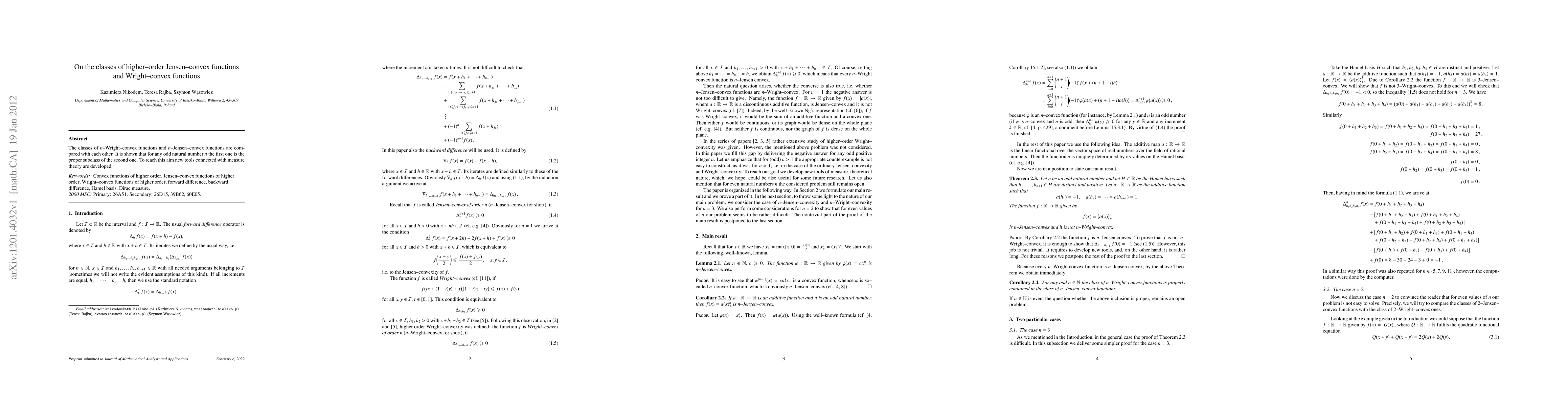 The classes of n-Wright-convex functions and n-Jensen-convex functions are compared with each other. It is shown that for any odd natural number $n$ the first one is the proper subclass of the second one. To reach this aim new tools connected with measure theory are developed.